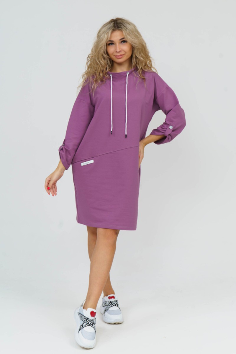 Представляем Вашему вниманию эффектное женское платье в стиле спорт-шик. Модель прямого силуэта со спущенным плечом выполнена из трикотажного полотна футера. Платье с воротником-стойкой и с регулируемыми патами на рукавах. В качестве отделки переда выполнен асимметричный подрез, в котором расположен прорезной карман. Спинка без конструктивных особенностей. Низ ровный. Завершает образ стильная нашивка на кармане. Платье уместно для любого мероприятия.