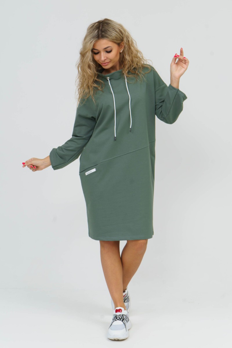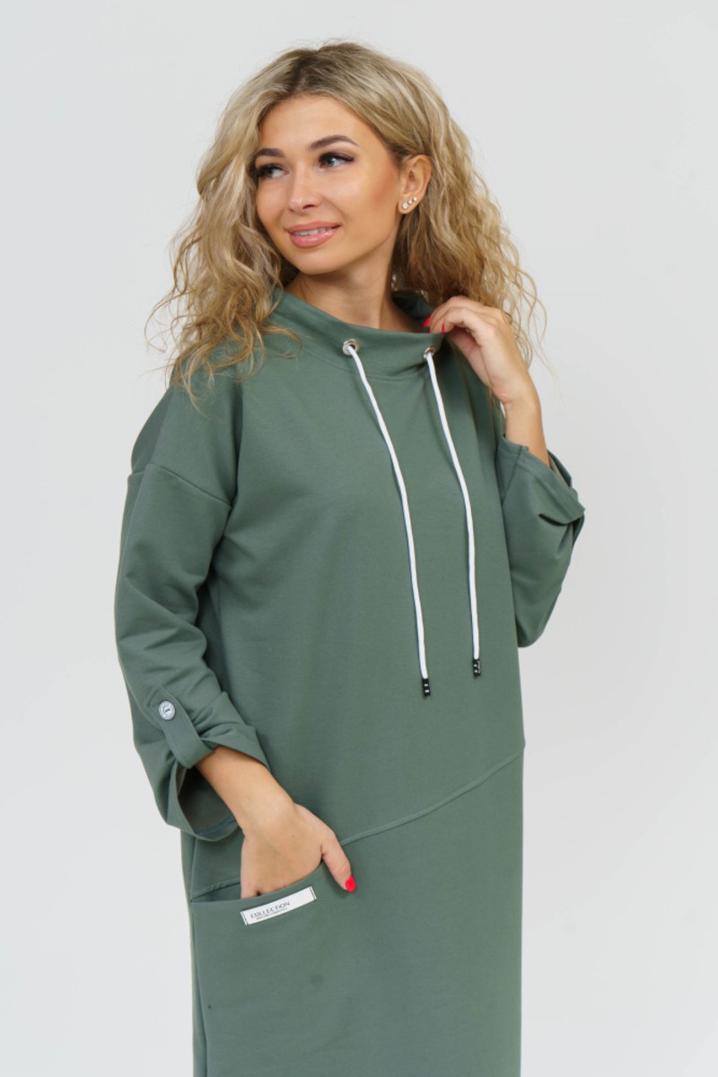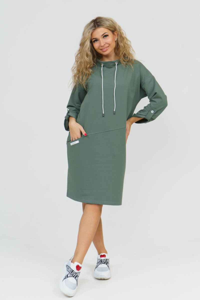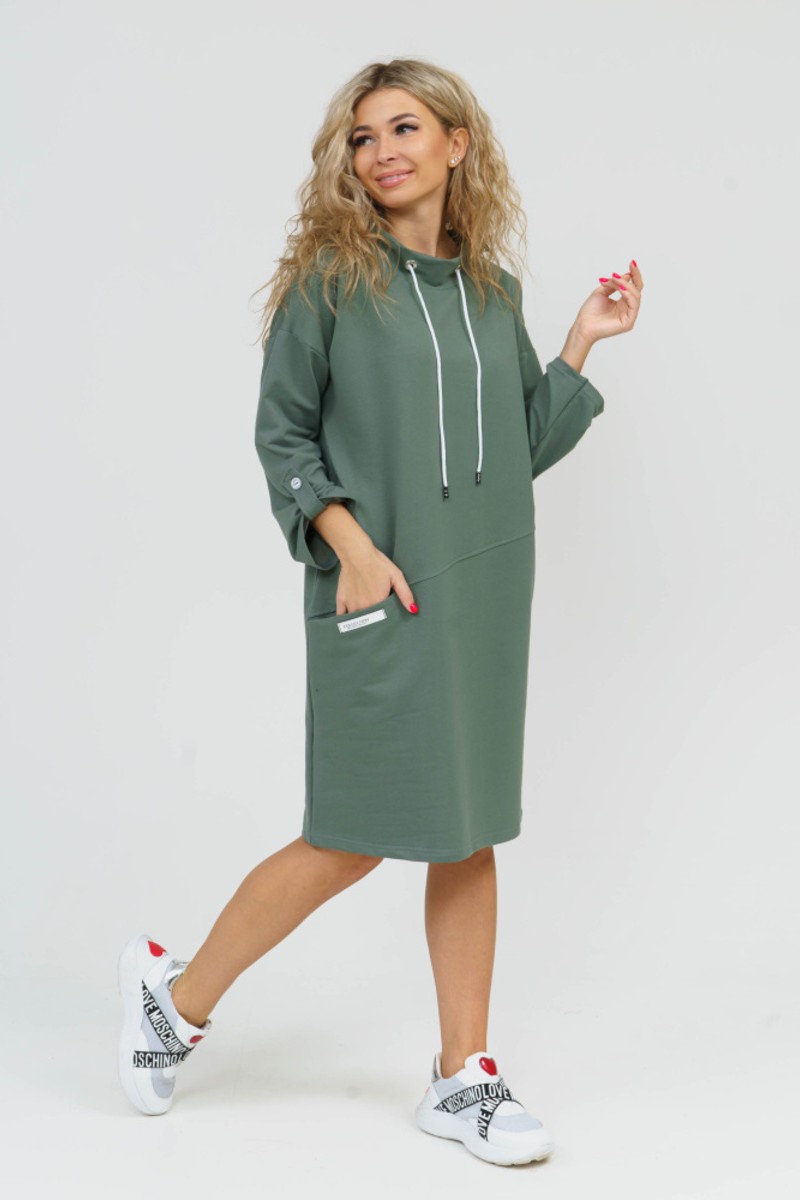 Представляем Вашему вниманию эффектное женское платье в стиле спорт-шик. Модель прямого силуэта со спущенным плечом выполнена из трикотажного полотна футера. Платье с воротником-стойкой и с регулируемыми патами на рукавах. В качестве отделки переда выполнен асимметричный подрез, в котором расположен прорезной карман. Спинка без конструктивных особенностей. Низ ровный. Завершает образ стильная нашивка на кармане. Платье уместно для любого мероприятия.