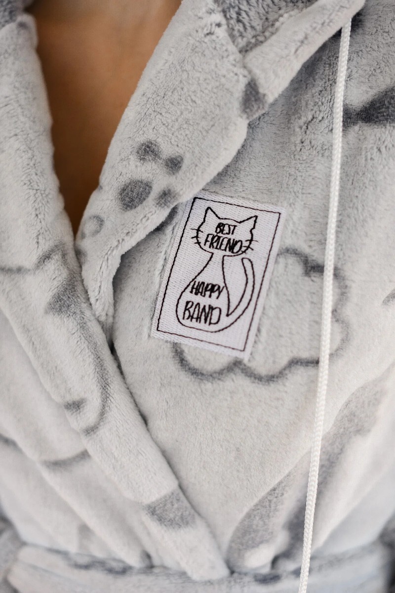 Представляем Вашему вниманию халат запашной с «3Д» рисунком «косы», с поясом длиной ниже колена с капюшоном с ушками, двумя накладными карманами, длинным втачным рукавом. На левой полочке тематическая вышивка, шнур с помпонами. Низ изделия обработан швом «в подгибку». Изделие с ворсом – перед эксплуатацией рекомендована стирка для удаления остаточного мелкого ворса полотна.