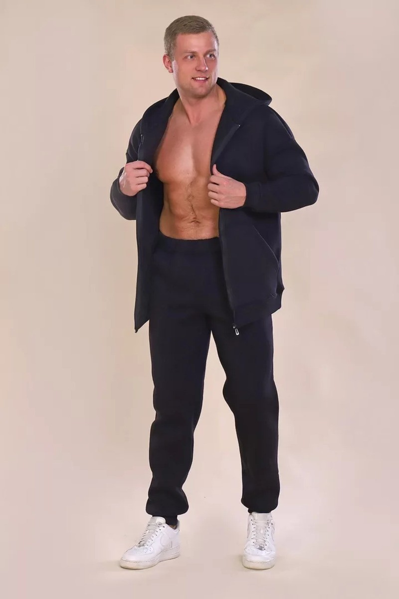 Представляем Вашему вниманию практичный и комфортный мужской костюм двойку, сшитый из приятного телу, воздухопроницаемого футера 3-х нитки с начесом. Комплект состоит из толстовки, дополненной вместительными карманами и капюшоном, и длинных брюк с манжетами по низу.