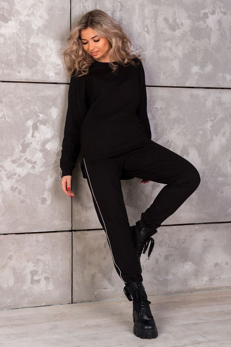 Представляем Вашему вниманию костюм женский молодежный, который состоит из свитшота и брюк. Кофта оверсайз длиной ниже линии бедер. Плечо спущенное, рукав длинный втачной с манжетой из кашкорсе. Горловина округлой формы с обтачкой из кашкорсе. Спинка с кокеткой, с переходящим швом на рукав. В шов вставлен кант контрастного цвета. Боковой шов переведен на перед. В швах внутренние боковые карманы. Низ толстовки с притачным поясом и боковыми разрезами. Брюки длинные, слегка зауженные к низу, с контрастным кантом по боковому шву. Пояс притачной, с резинкой и декоративными строчками. Боковые внутренние карманы с наклонным входом.