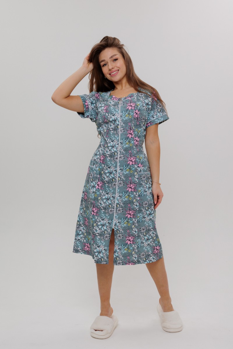 Представляем Вашему вниманию легкий и удобный женский халат на молнии. Модель дополнена цельнокроенным рукавом, фигурным вырезом горловины, вместительными накладными карманами, прочной застежкой-молнией, поясом, а также горловиной, входами в карманы и низом рукавов, отделанными контрастным узким кантом. Модель выполнена из высококачественного хлопка, хорошо пропускающего воздух, за счет чего кожа может дышать.