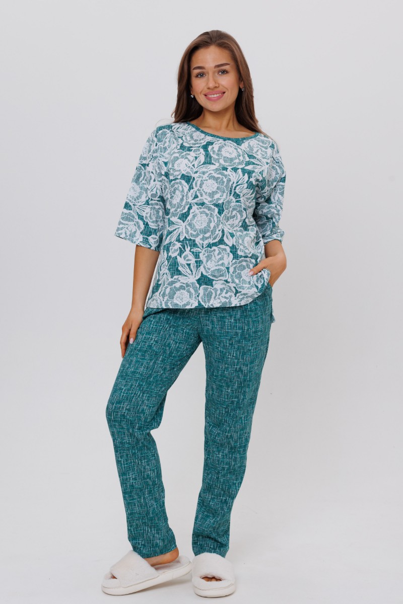 Представляем Вашему вниманию легкий женский костюм двойку, сшитый из приятной телу, воздухопроницаемой кулирки - 100% натуральный хлопок. Изящный комплект состоит из футболки с рукавом 3/4 и брюк. Горловина у футболки отделана тканью-компаньоном.