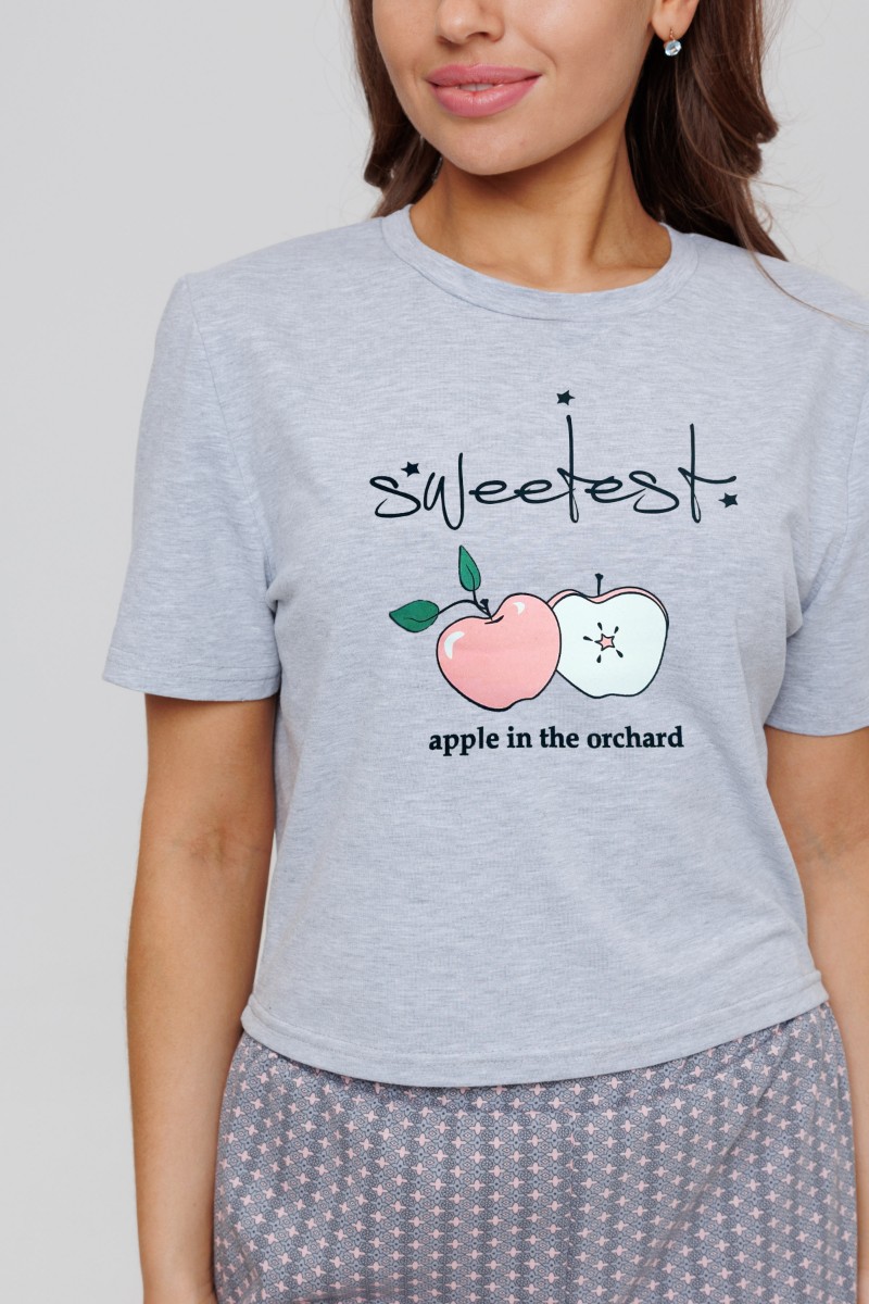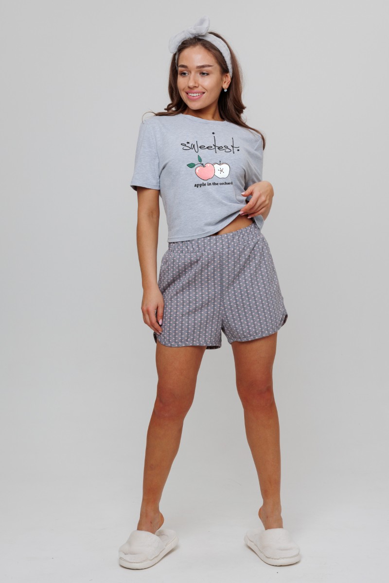 Представляем Вашему вниманию легкий костюм домашний с шортами из кулирки. Состоит из кроп-топа и шорт. На передней полочке топа дизайнерский принт. Шорты завышенной посадки с окантовкой по низу.