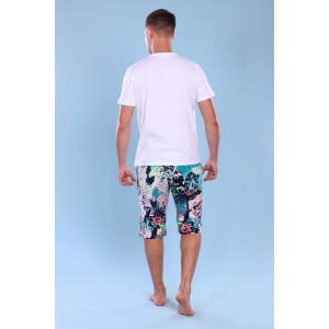 Представляем Вашему вниманию мужской костюм двойку, который состоит из футболки и шорт. Футболка из гладкокрашенного трикотажного полотна, полуприлегающего силуэта с яркой печатью на полочке. Рукав втачной короткий. Горловина округлой формы обработана обтачкой. Низ изделия и рукавов подогнут. Шорты из трикотажного полотна с оригинальным принтом, полуприлегающего силуэта с накладными карманами и притачным поясом. Низ изделия подогнут.