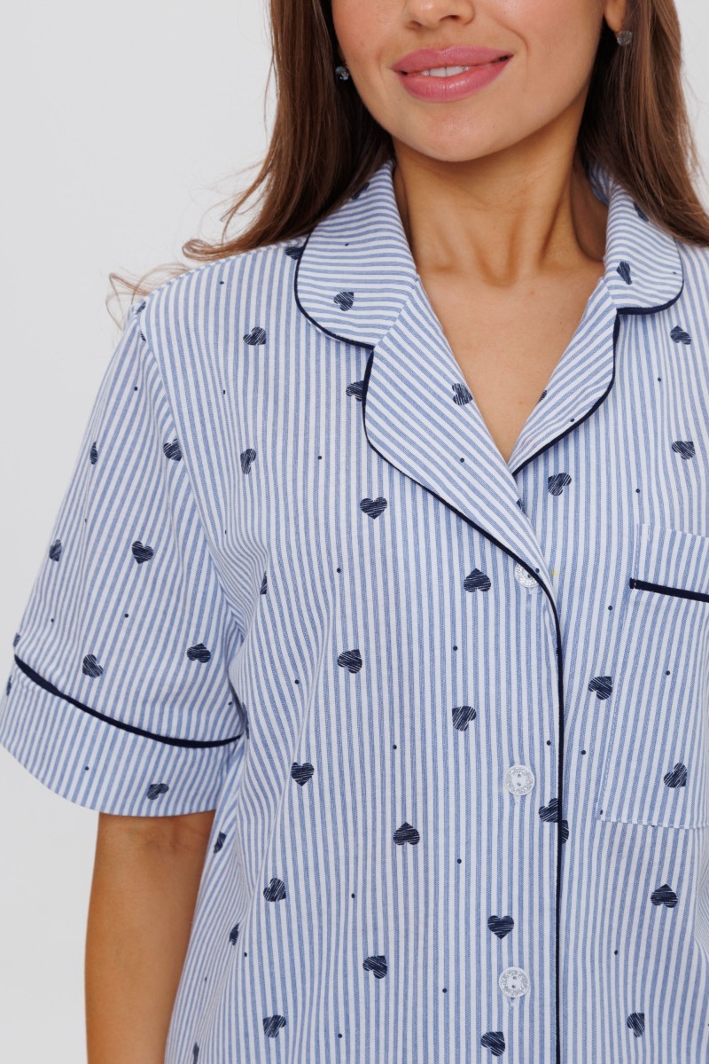 Представляем Вашему вниманию легкий женский костюм двойку для дома, который состоит из жакета и брюк. Рукав втачной, короткий. Отделка элементов выполнена контрастным кантом. Нагрудный карман. Брюки длинные, прямого силуэта. Пояс на резинке. Правильная посадка.
