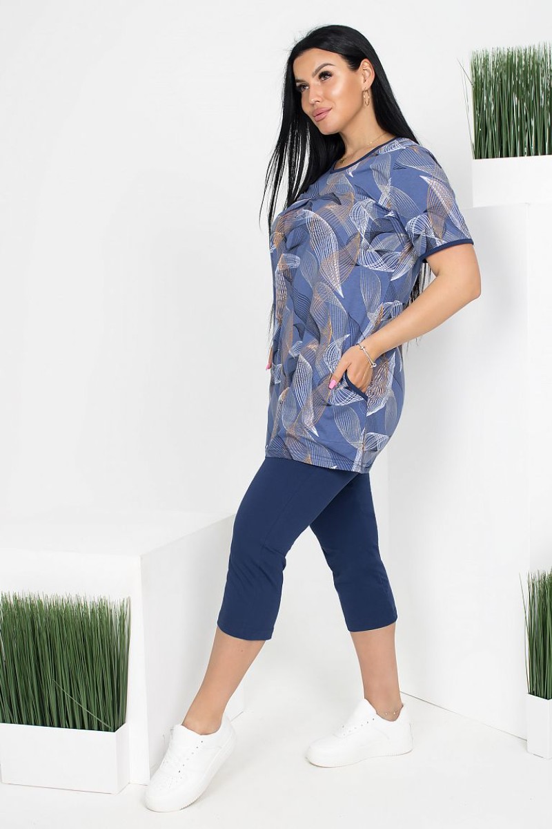 Представляем Вашему вниманию легкий женский костюм двойку из кулирки, который состоит из туники и бридж. Туника свободная, длиной до середины бедра. Перед с кокеткой и встречной складкой. Рукава втачные, короткие. Боковые карманы с окантованным входом. Горловина округлой формы и низ рукава окантованы отделочным полотном. Бриджи базовые, облегающие фигуру, длиной до середины икр. Верх с резинкой. Без карманов.