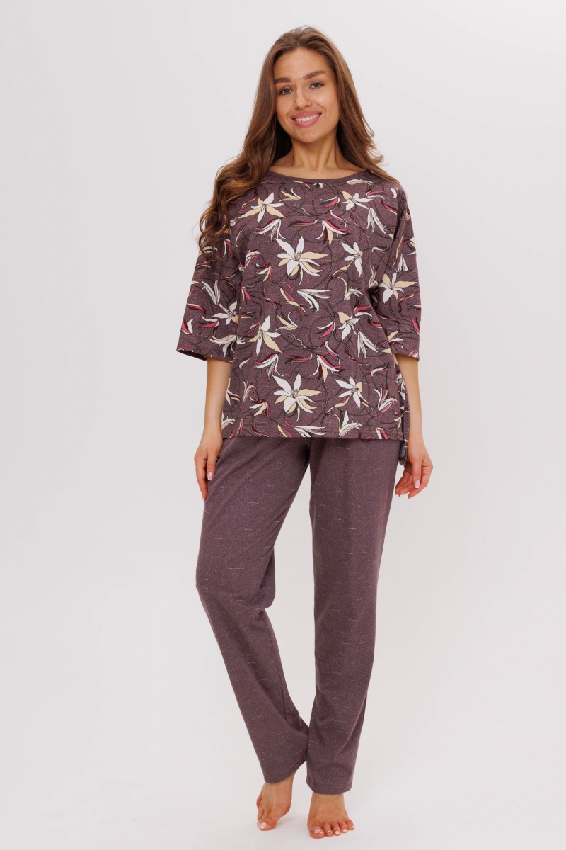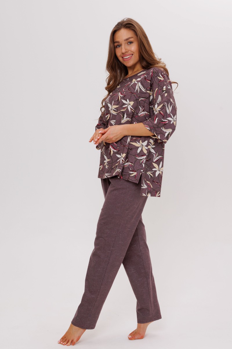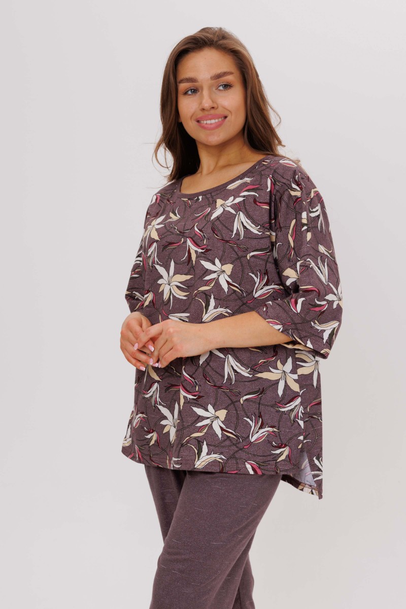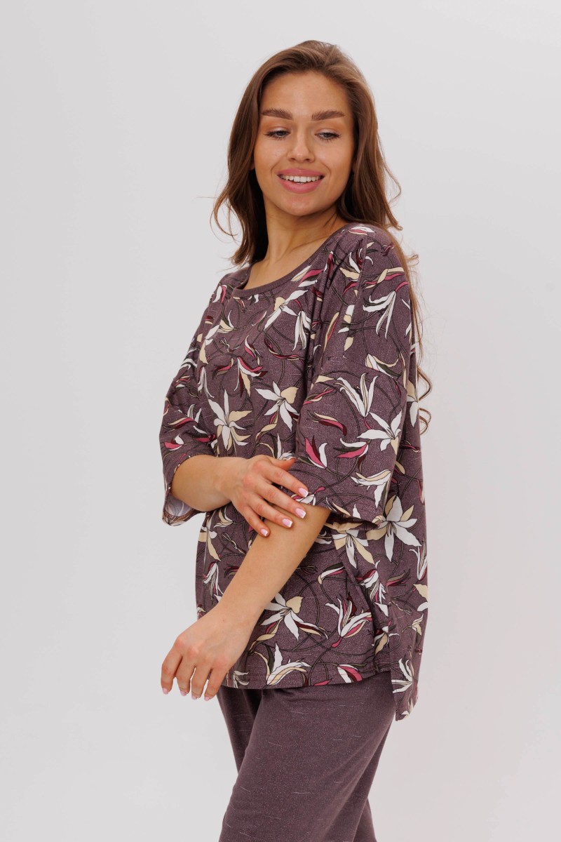 Представляем Вашему вниманию женский домашний костюм свободного силуэта, выполненный из тканей-компаньонов. Футболка прямого силуэта. Рукав втачной, спущенное плечо, длина до локтя. Боковые разрезы. Брюки длинные, прямого кроя. Пояс на резинке. Прорезные карманы.