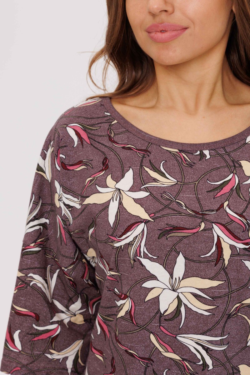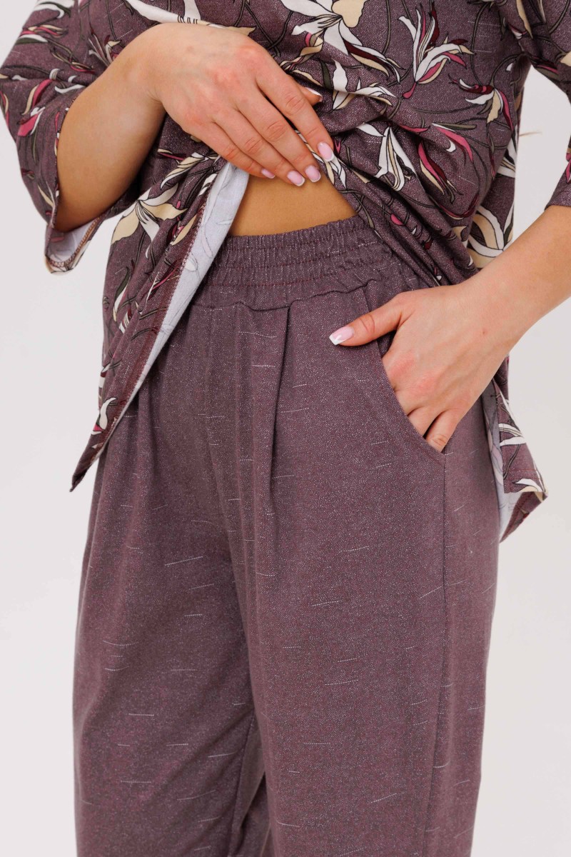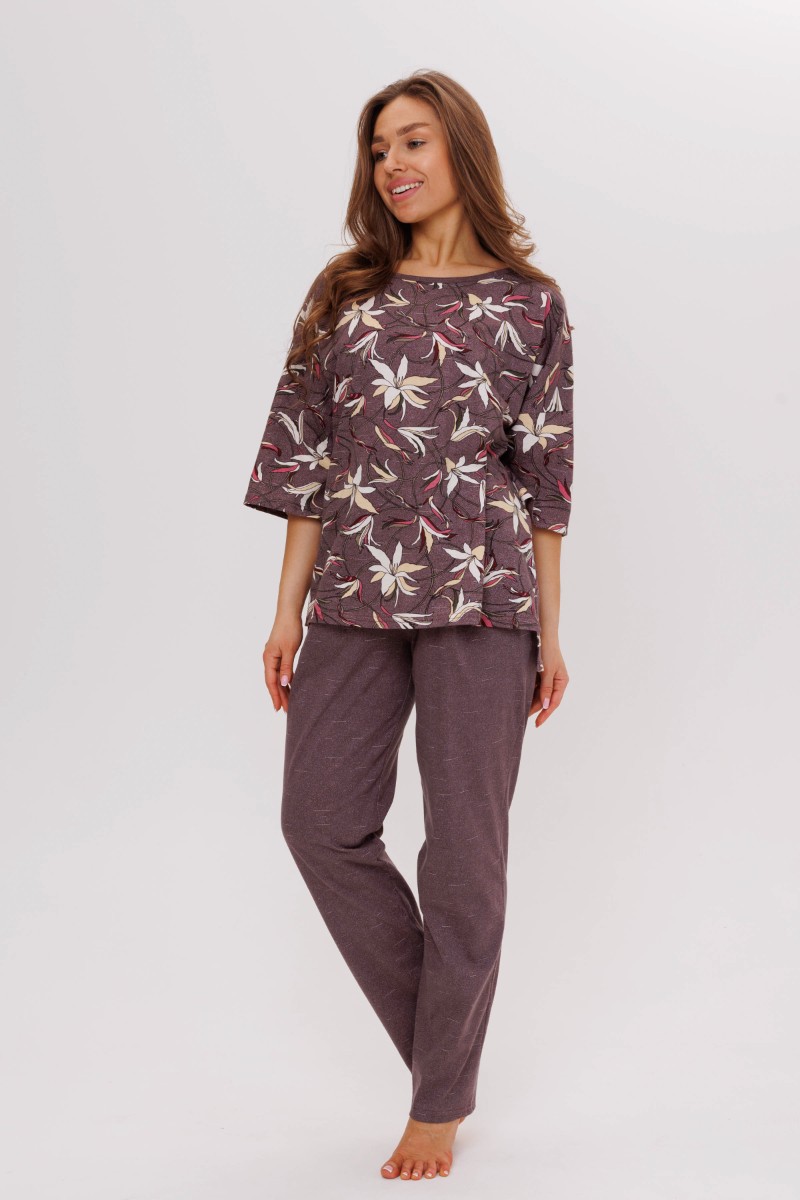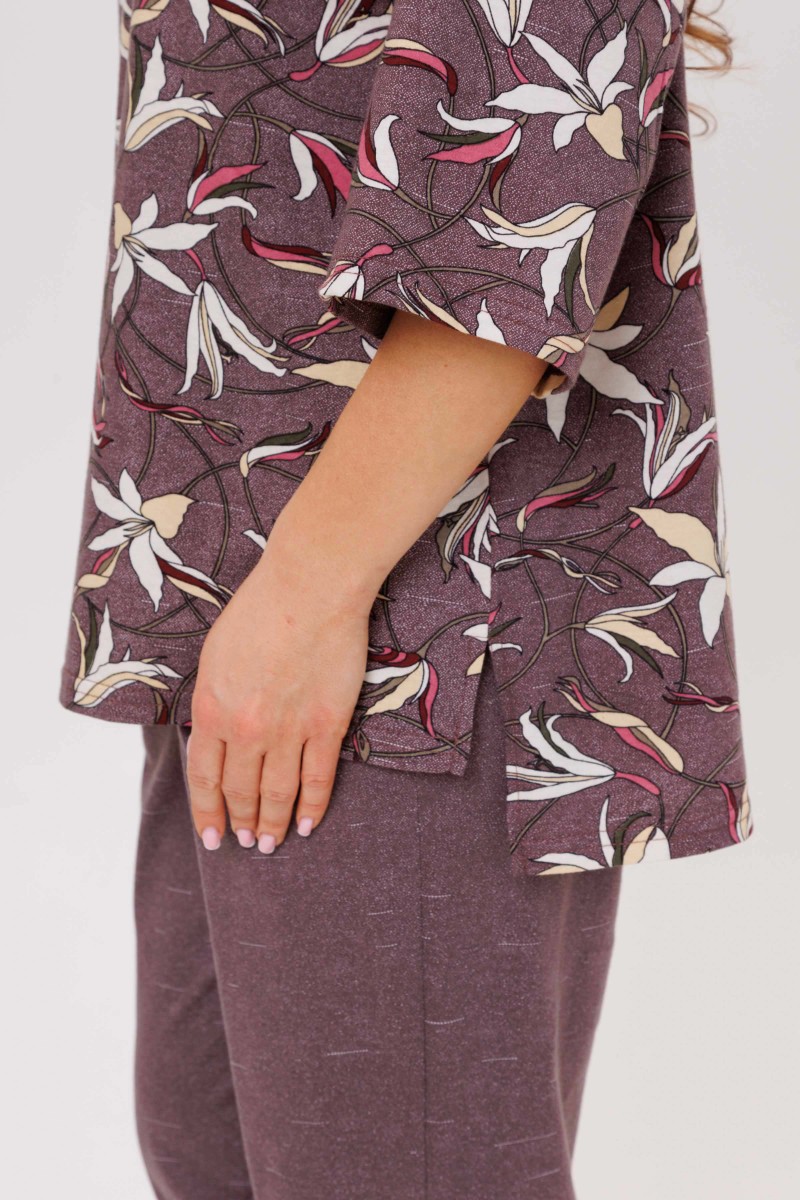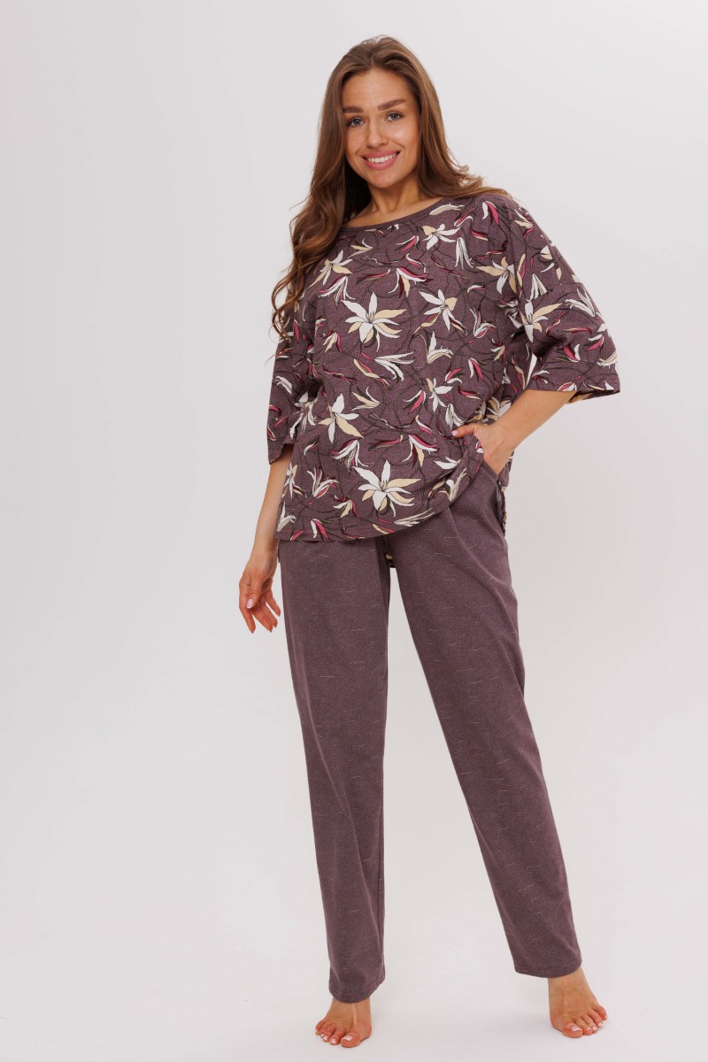 Представляем Вашему вниманию женский домашний костюм свободного силуэта, выполненный из тканей-компаньонов. Футболка прямого силуэта. Рукав втачной, спущенное плечо, длина до локтя. Боковые разрезы. Брюки длинные, прямого кроя. Пояс на резинке. Прорезные карманы.