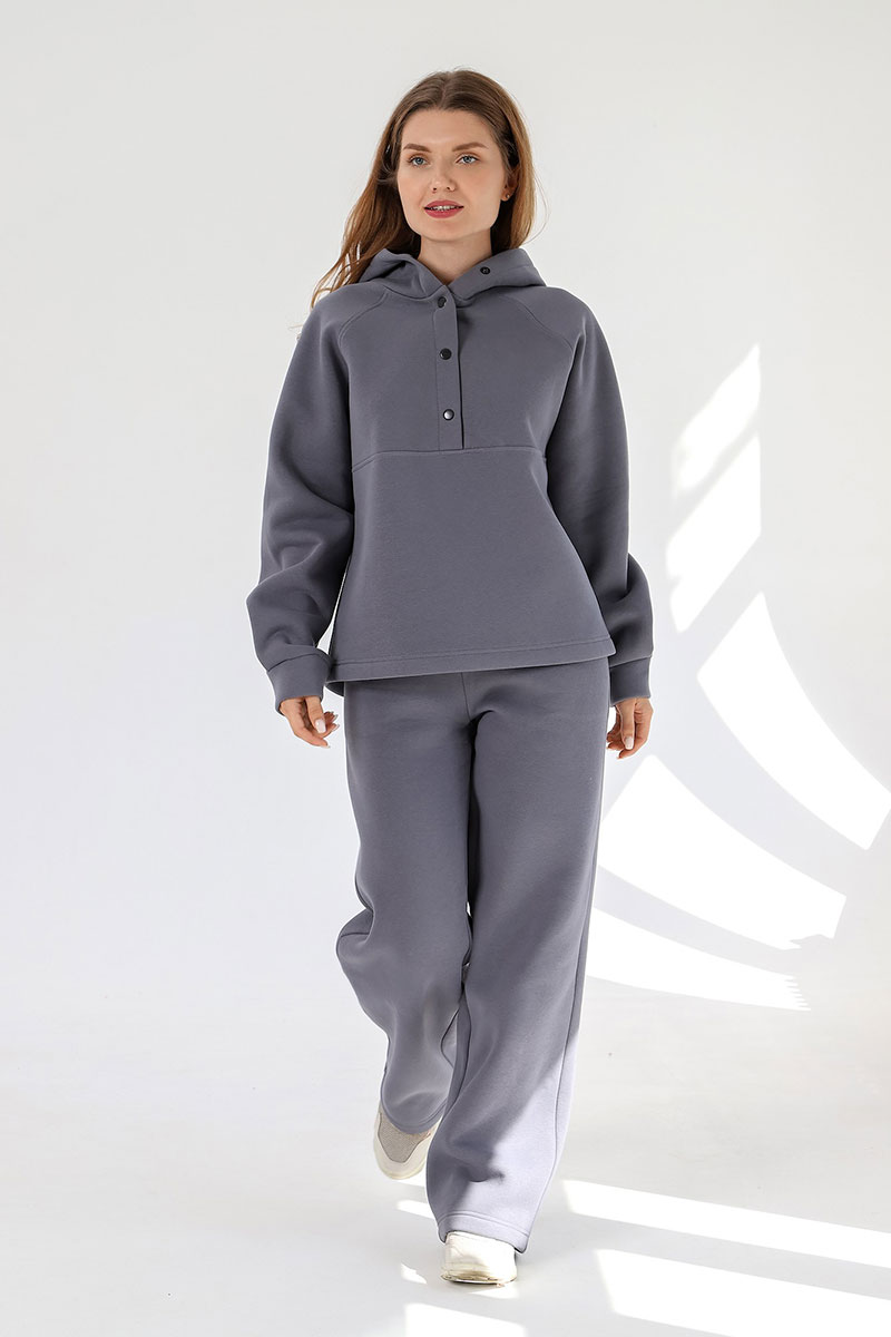 Представляем Вашему вниманию эффектный женский костюм из футера с начесом. Джемпер с застежкой на кнопки в верхней части, с капюшоном на подкладке, рукавами покроя ""реглан"", со складками и манжетами по низу рукавов. Брюки расширенные книзу, на притачном поясе с отстроченной эластичной тесьмой и внутренним шнуром, с карманами в боковых швах. Этот наряд подарит Вам комфортные ощущения и отличное настроение!