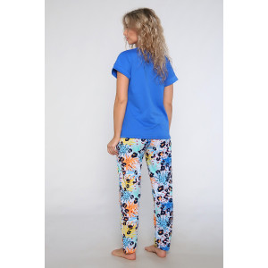Представляем Вашему вниманию изящный женский костюм двойку, который состоит из футболки и брюк. Футболка с манжетами на спущенном плече и принтом. Брюки прямые с боковыми карманами. Идеальный повседневный вариант.