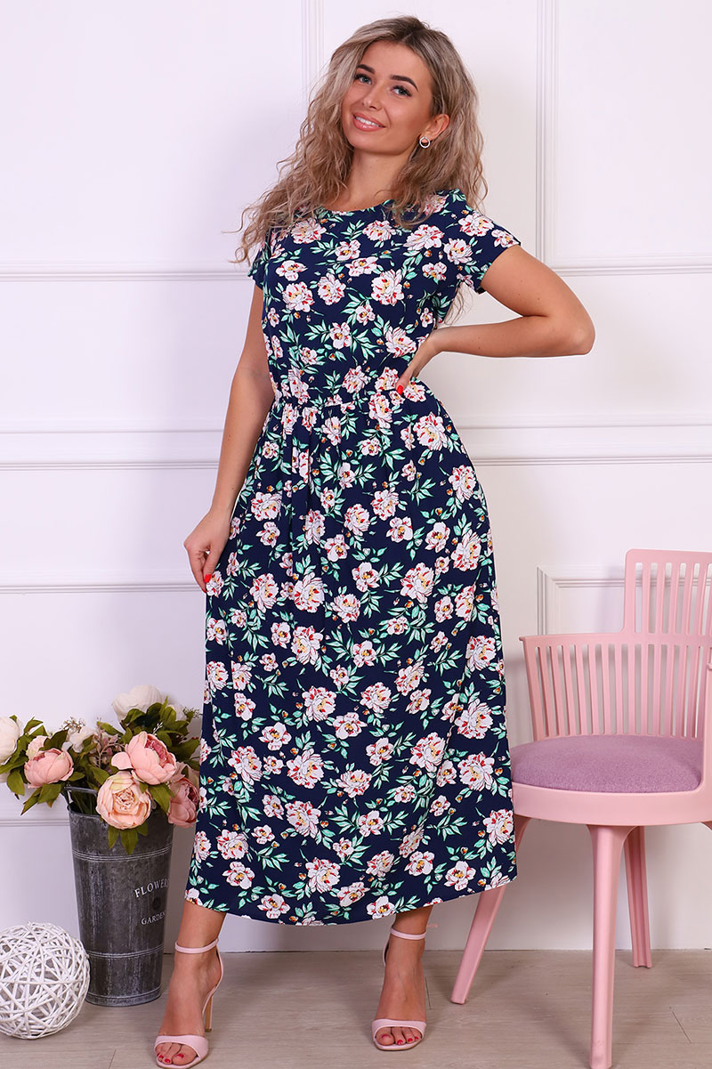 Представляем Вашему вниманию изящное женское платье из штапеля. Горловина, низ рукава и низ платья подшиты на прямострочке. Талия подчеркнута резинкой. В боковых швах карманы.