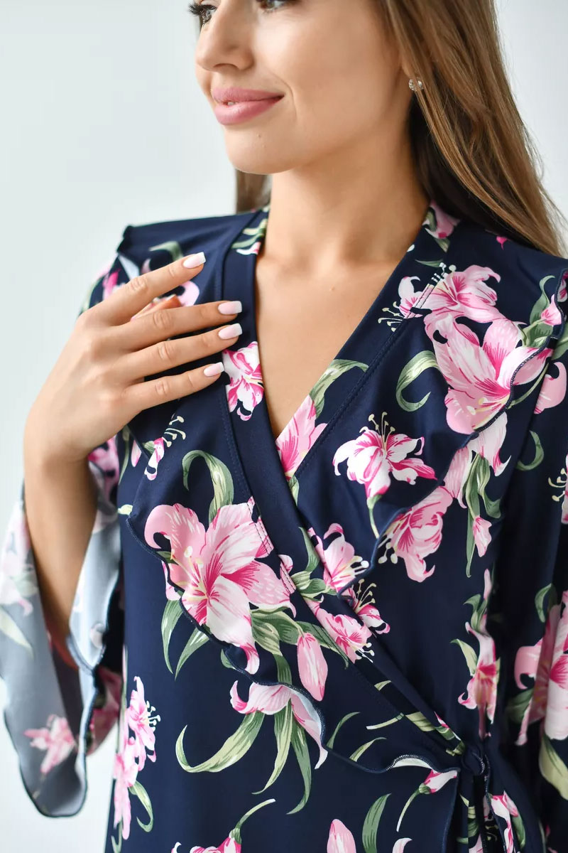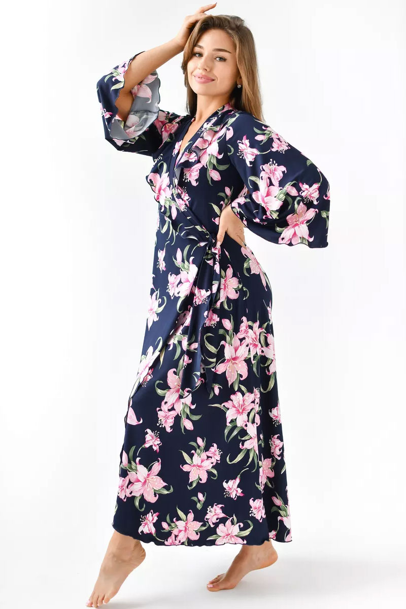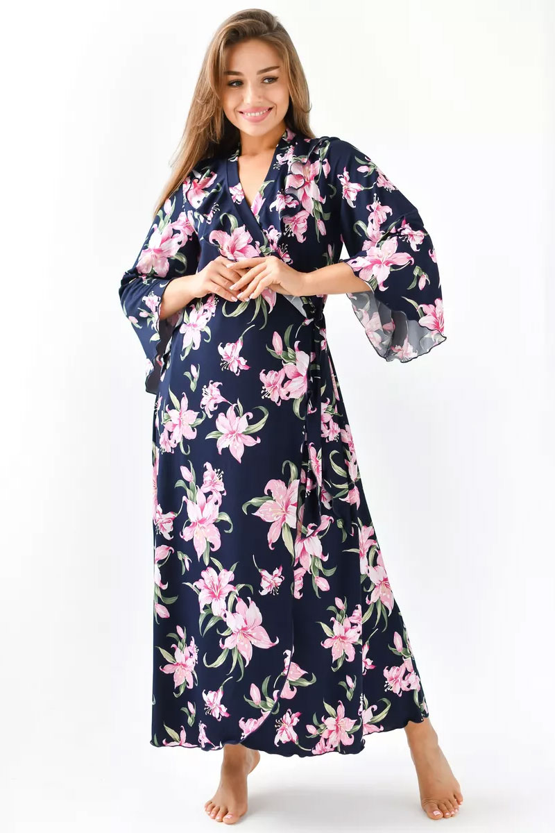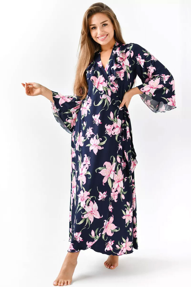 Представляем Вашему вниманию очаровательный женский халат "Матушка". Халат на запах, длинный, полуприлегающего силуэта, расклешенный к низу, длиной до середины икры. Линия талии завышена. На полочках, в области груди воланы. Рукав втачной, длиной 3/4. Части пояса втачные, располагаются на завышенной линии талии.