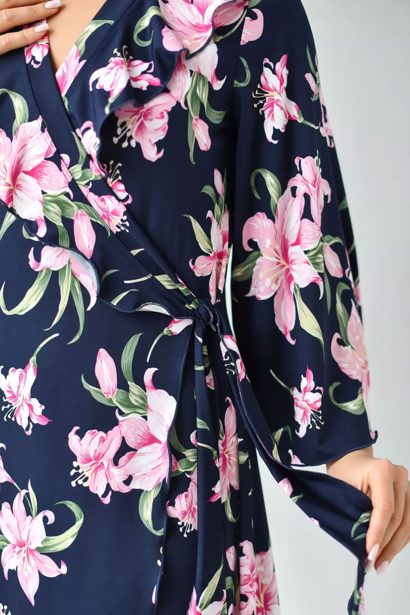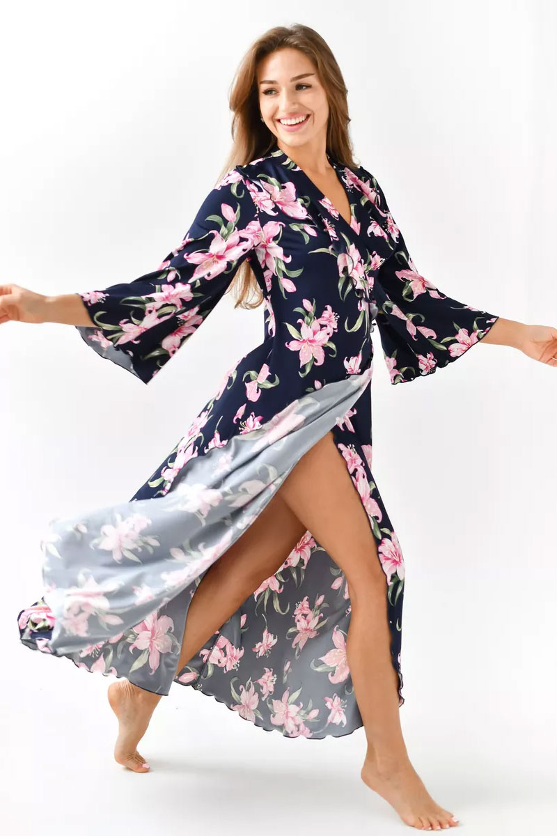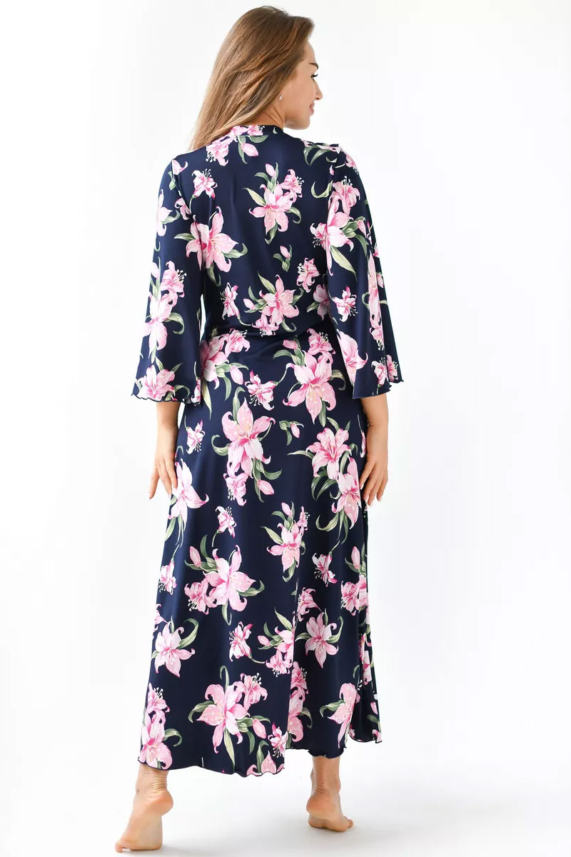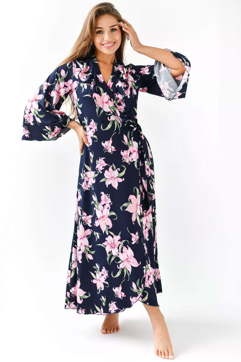 Представляем Вашему вниманию очаровательный женский халат "Матушка". Халат на запах, длинный, полуприлегающего силуэта, расклешенный к низу, длиной до середины икры. Линия талии завышена. На полочках, в области груди воланы. Рукав втачной, длиной 3/4. Части пояса втачные, располагаются на завышенной линии талии.