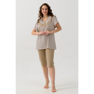 Представляем Вашему вниманию легкую женскую пижаму, которая состоит из футболки и бридж. Футболка с круглым вырезом горловины и цельнокроеным рукавом. На полочке фигурная кокетка из отделочного материала отделанная кружевом, на планках с застежкой на кнопки. Горловина и низ рукавов окантованы отделочным материалом. Бриджи прямые из набивного полотна, верх на резинке, низ окантован отделочным материалом. Машинная стирка.