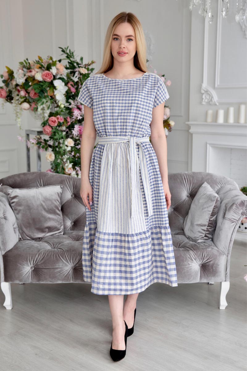 Представляем Вашему вниманию легкое женское платье в клетку - это настоящий тренд, которые еще долгое время будет в моде. Такое платье придаст Вашему образу нотку романтичности. Сочетание клетки и полосы - интересное дизайнерское решение на любую фигуру. Изделие из натурального льна прекрасно подойдет для создания женственного образа в жаркие весенне-летний сезон.