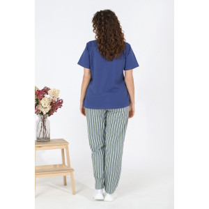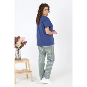 Представляем Вашему вниманию женский костюм из трикотажного полотна «кулирка» в комбинации двух видов в единой цветовой гамме: гладкокрашеный и с набивным рисунком, состоящий из футболки и брюк. Футболка - из гладкокрашеного трикотажного полотна «кулирка» классического покроя, с короткими втачными рукавами, горловиной V-образной формы, обработанной втачной планкой и принтом на полочке. Брюки – из полотна в полоску, длинные, слегка зауженные книзу, на притачном поясе с эластичной тесьмой внутри, с карманами в боковых швах.