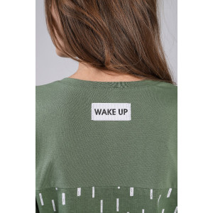 Представляем Вашему вниманию женский костюм из трикотажного полотна «кулирка» в комбинации двух видов полотна в единой цветовой гамме: гладкокрашеного и с набивным рисунком, состоящий из футболки и брюк. Футболка – из гладкокрашеного полотна, классического покроя, с короткими втачными рукавами, горловиной овальной формы, обработанной притачной бейкой из отделочного материала и принтом в центре переда, выполненным в технике шелкографии. Брюки – укороченные, 7/8 длины, на притачном поясе с эластичной тесьмой внутри и карманами в боковых швах.