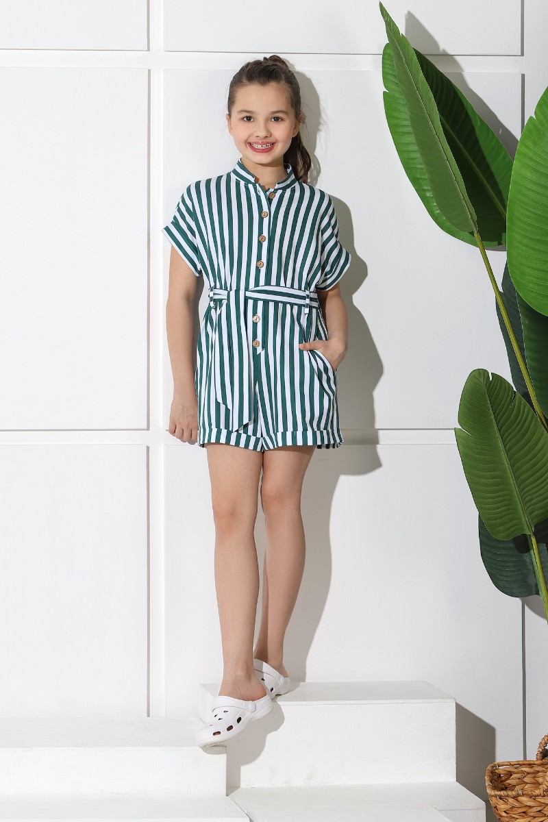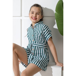 Представляем Вашему вниманию модный летний вариант для девочки - комбинезон из хлопкового трикотажного полотна кулирного переплетения с набивным рисунком в вертикальную полоску. Модель с воротником-стойкой, с застежкой на пуговицы спереди, с поясом в шлевках по линии талии, с боковыми карманами, с манжетами по низу шорт и цельнокроенных коротких рукавов.