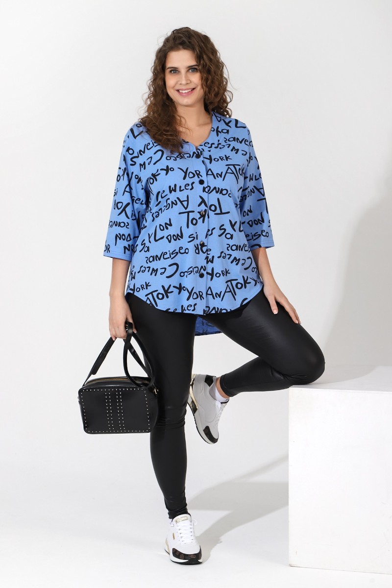 Представляем Вашему вниманию женскую тунику из трикотажного полотна «кулирка» с набивным рисунком, свободного покроя, с горловиной овальной формы, обработанной спереди притачными фигурными планками, втачными рукавами длиной 3/4, центральной бортовой застежкой на петли и пуговицы и фигурной линией низа.