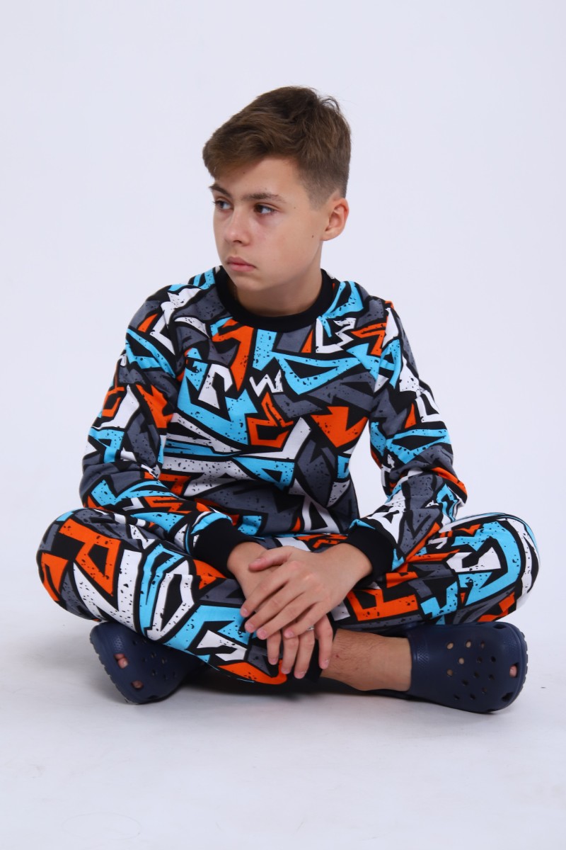 Представляем Вашему вниманию яркую детскую пижаму, сшитую из уютного трикотажа. Домашний комплект состоит из кофты с округлой горловиной и рукавами-реглан и брюк с эластичным поясом и манжетами по низу. В этой пижаме Ваш ребенок будет чувствовать себя тепло и комфортно.
