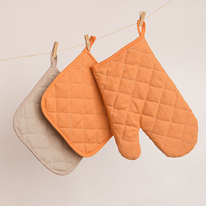 Представляем Вашему вниманию стильный набор, незаменимый на кухне каждой хозяйки. Изготовлен из высококачественного натурального сырья. Саржа - хлопчатобумажная плотная ткань, обладает износостойкостью, низкой сминаемостью. Набор выполнен из саржи 160 гр./кв.м., 100 % хлопок, с наполнителем ватин белый х/б, плотностью 280 гр./кв.м. В состав набора входит: стеганая рукавичка- прихватка 30х17 - 1 шт., прихватка квадратная 20х20 - 1 шт. Изделия практичны и просты в уходе. Пошив в строгом соответствии с ГОСТ. Изделия практичны и просты в уходе.