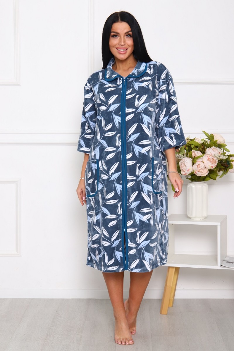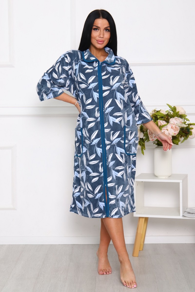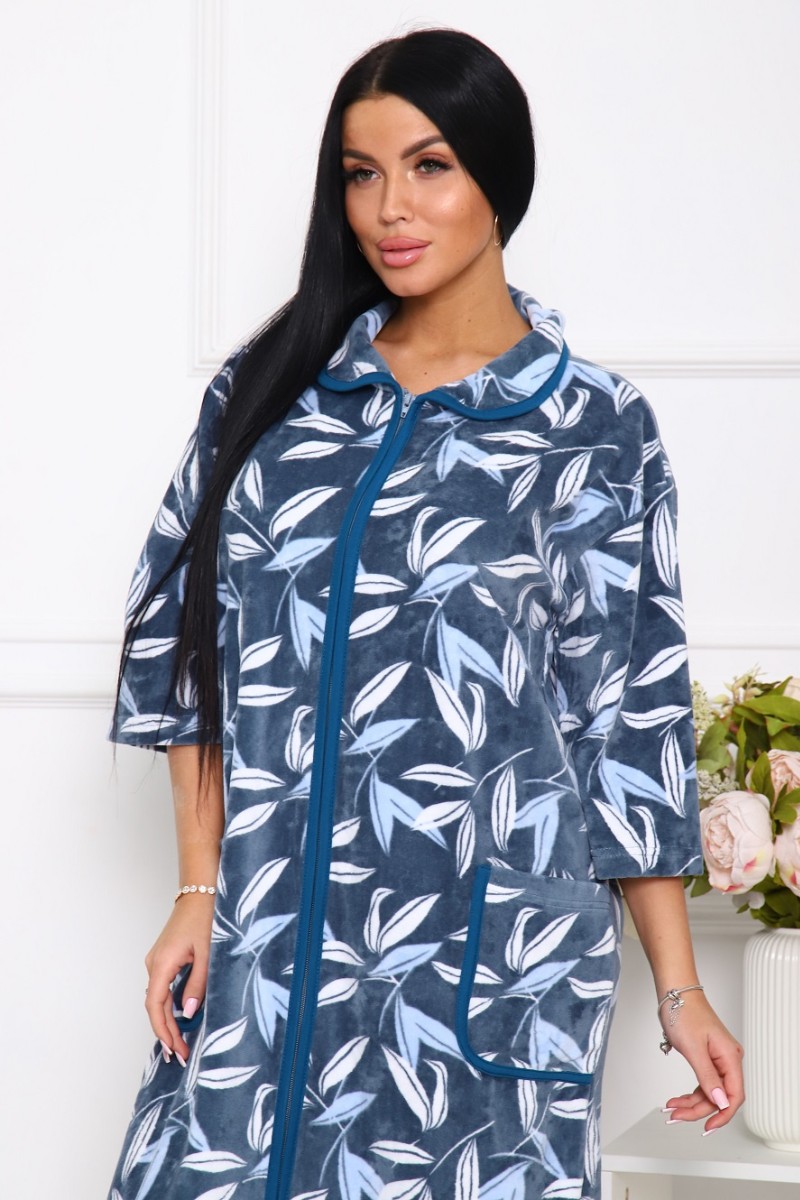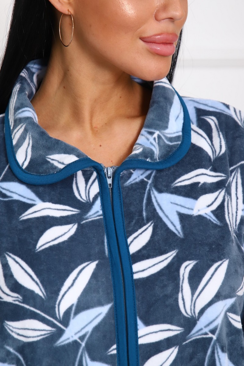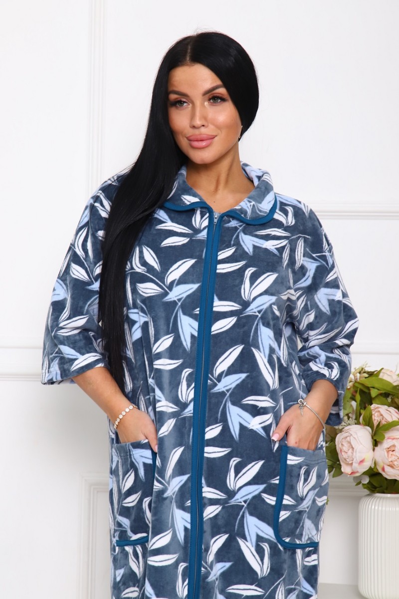 Представляем Вашему вниманию легкий женский халат из велюра - теплого, уютного и приятного к телу материала. Халат с рукавом 3/4 на молнии, есть карманы, свободного кроя. Модель имеет интересную расцветку, которая красиво смотрится и поднимает настроение. Изделие хорошо сидит на фигуре и подчеркивает её достоинства. В нём Вы будете чувствовать себя комфортно и уверенно.