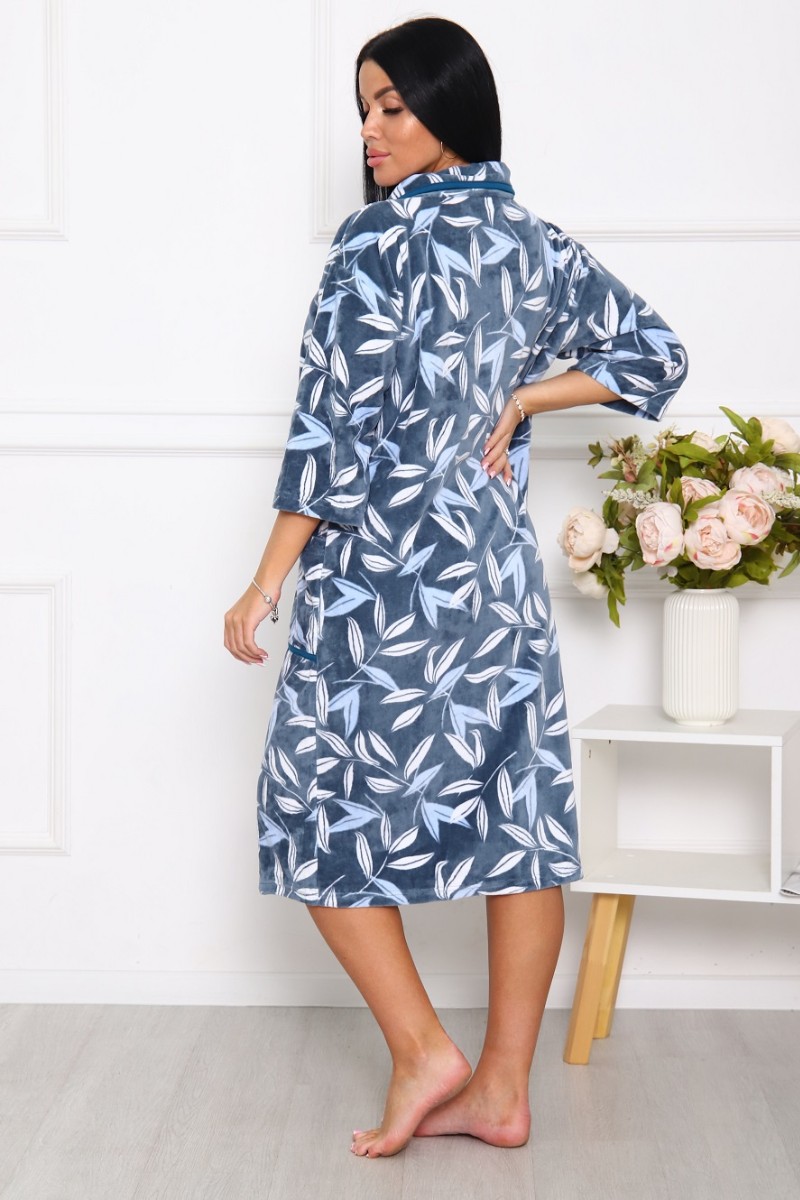 Халат женский 010 велюр (последний размер) серо-зеленый-листья 60-62