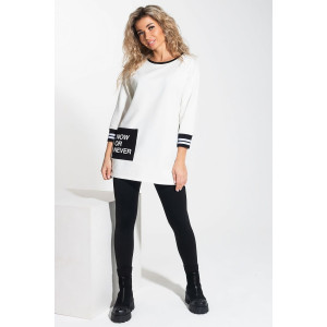 Представляем Вашему вниманию тунику женскую длиной до середины бедра, свободной формы, прямого силуэта. Плечо спущенное, рукав втачной, длиной 3/4 с трикотажной манжетой по низу. Горловина округлой формы, с обтачкой. Перед с накладным карманом и дизайнерским принтом.