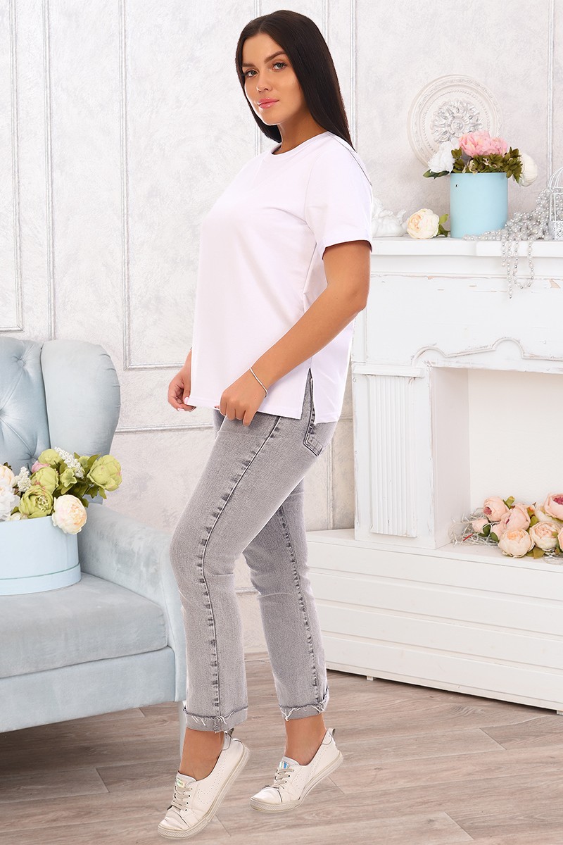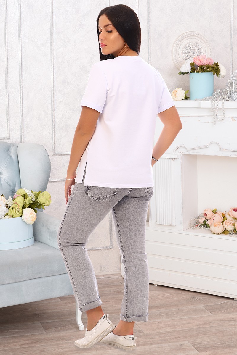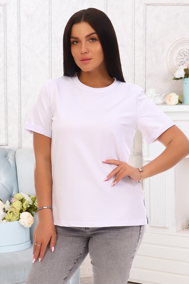 Представляем Вашему вниманию изящную женскую футболку с коротким рукавом с отворотом, горловина круглой формы из отделочного материала, в боковых швах разрезы.