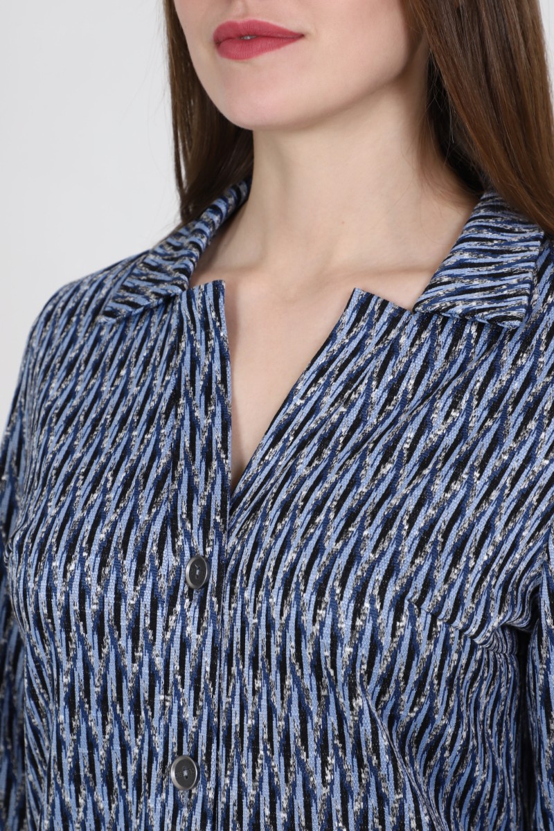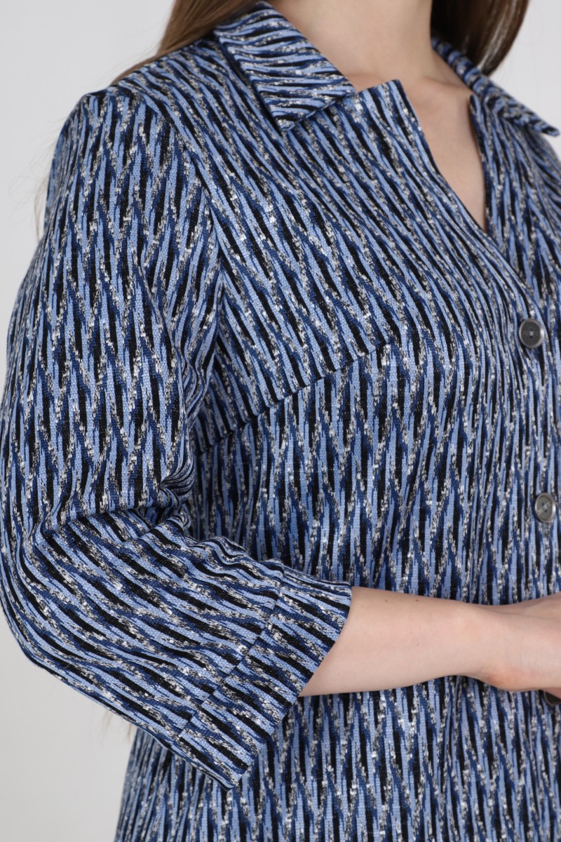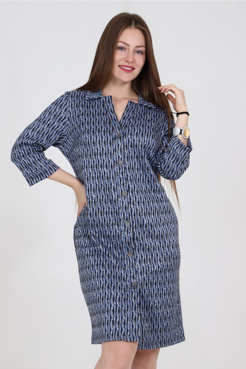 Представляем Вашему вниманию женское платье-халат на пуговицах из трикотажного жаккарда с пестрым принтом миссони-зигзаг. Отложной воротник, приталенный силуэт придают платью элегантный, офисный стиль. Рукава длиной три четверти.