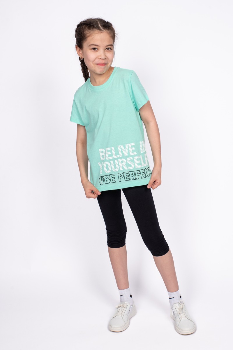 Представляем Вашему вниманию футболку для девочки прямого силуэта с втачным коротким рукавом. Горловина круглая обработана воротником из рибаны. Горловина по полочке и спинке отстрочена нитками в цвет изделия. Низ изделия и рукавов обработан швом в подгибку. На полочке принт шелкография. Надпись переводится как "Верь в себя; Будь идеальной".
