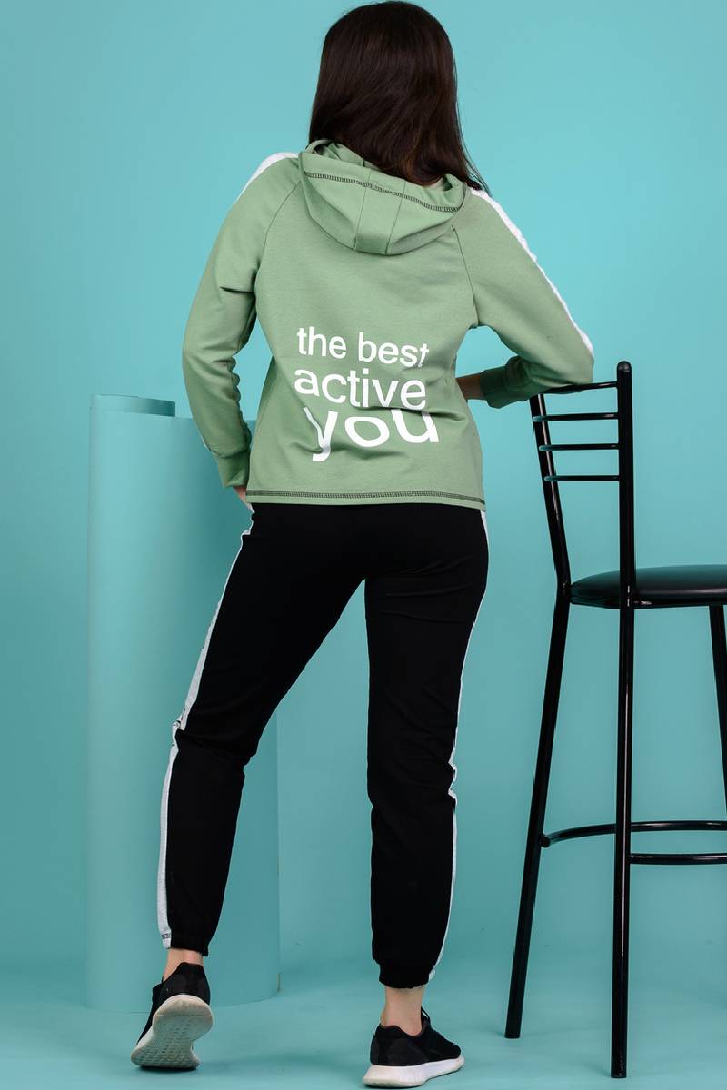 Представляем Вашему вниманию стильный женский костюм двойку, который состоит из толстовки и брюк. Брюки на поясе, с боковыми карманами, с лампасами из отделочного полотна по боковым швам, на резинке по низу. Толстовка прямая, на молнии, с капюшоном, с карманами "кенгуру", длиной до середины бедра. Рукав реглан, длинный, с лампасами из отделочного полотна вдоль рукава, на манжете.
