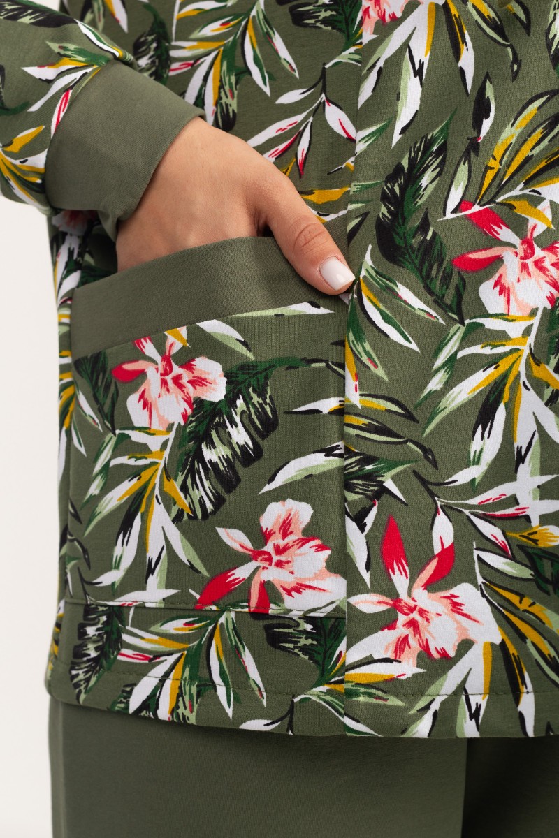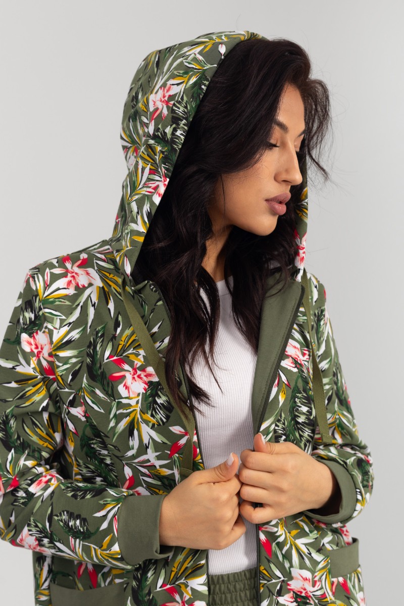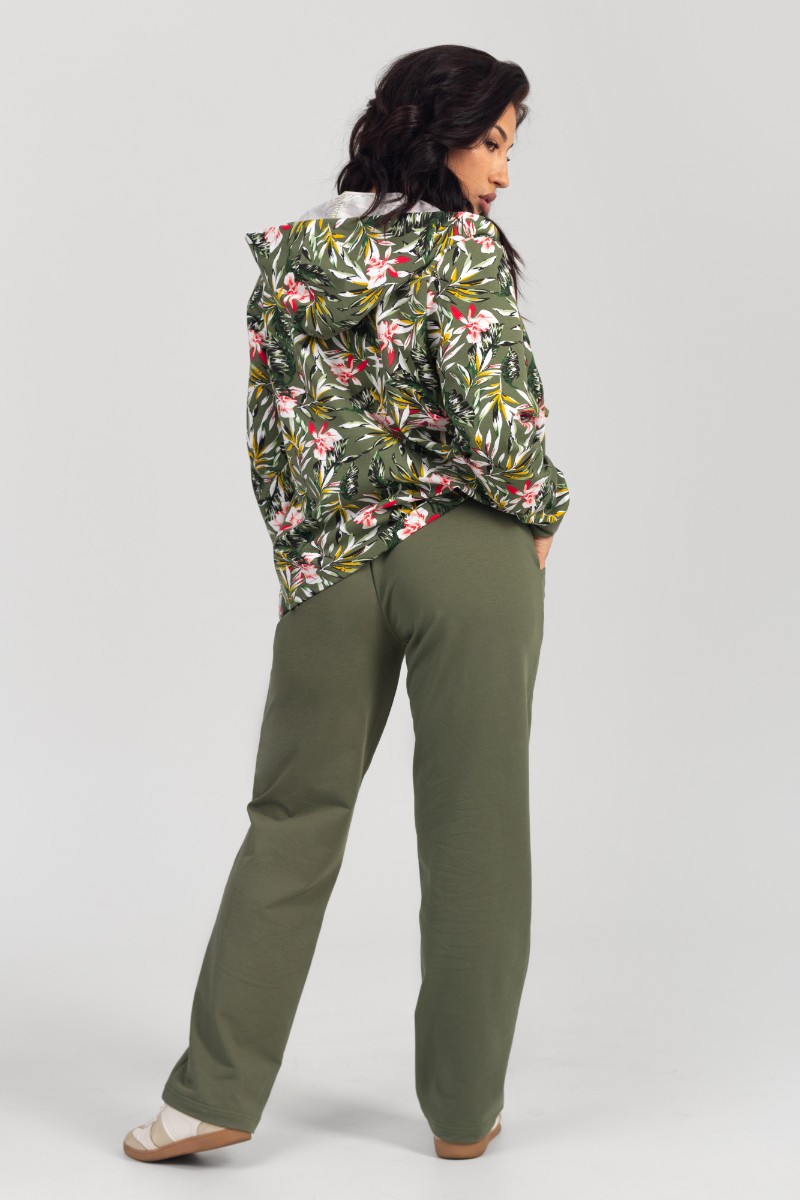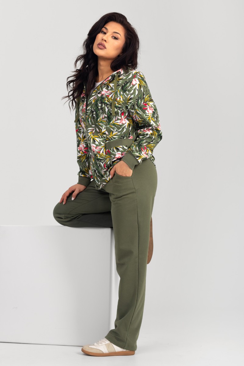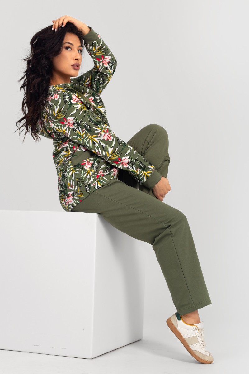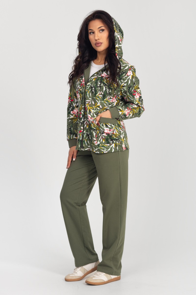 Представляем Вашему вниманию комфортный женский костюм двойку прямого силуэта, который состоит из кофты, украшенный контрастным и изящным принтом, и длинных брюк. Кофта дополнена вместительными карманами и удобным капюшоном. Комплект изготовлен из высококачественного материала, устойчивого к износу.