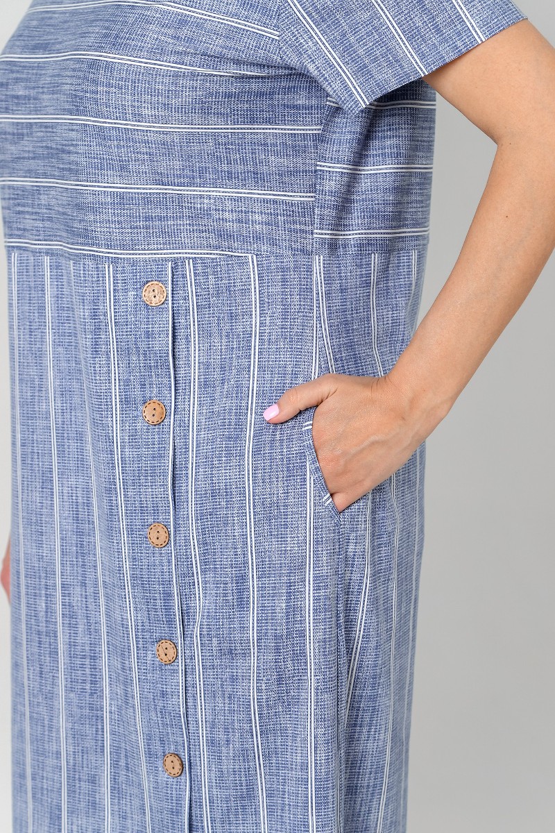 Представляем Вашему вниманию платье женское из трикотажного полотна «кулирка» с набивным рисунком, отрезное по талии, с короткими втачными рукавами, горловиной овальной формы, карманами в боковых швах. Нижняя деталь переда с ассиметричной застежкой на петли и пуговицы, карманы и горловина окантованы основным материалом.
