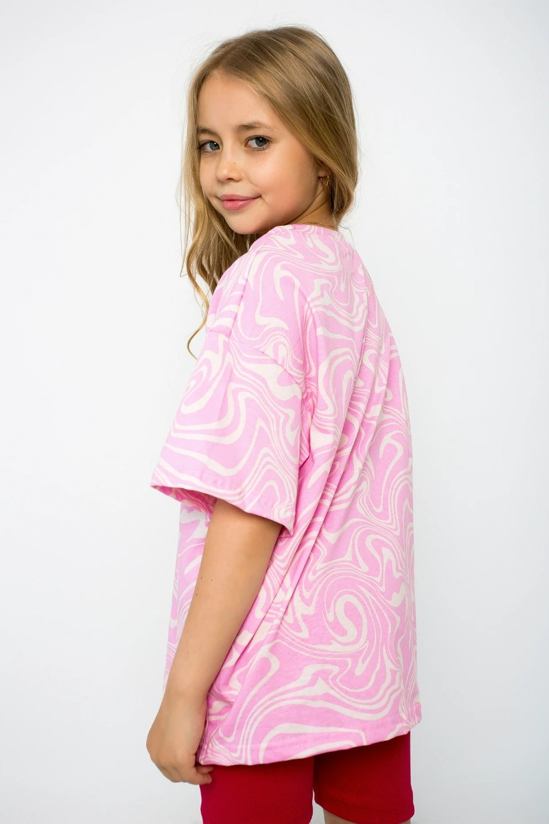 Представляем Вашему вниманию костюм на девочку, который состоит из футболки свободного кроя и велосипедок. Футболка из набивной кулирки, горловина округлой формы, рукава со спущенной линией плеча. Велосипедки из ткани с добавлением эластана, хорошо прилегают к телу, не сковывая движения.
