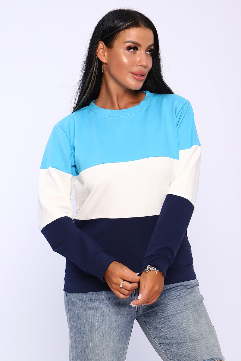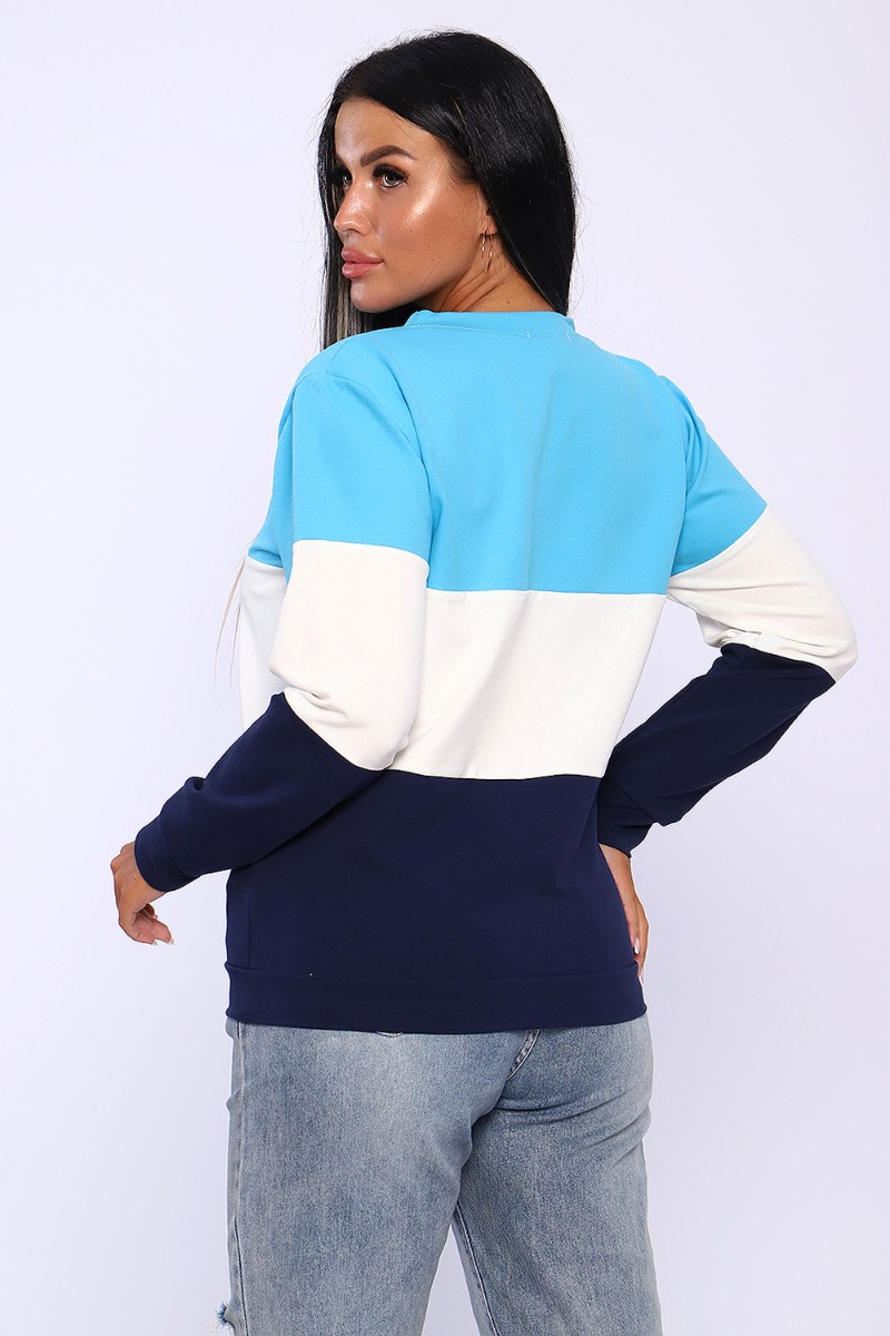 Представляем Вашему вниманию эффектный женский свитшот, выполненный из футера трех цветов. Рукава и низ на манжете. Свитшот свободного кроя. Свитшот можно сочетать с джинсами, брюками, юбками, а так же использовать со спортивными брюками и кроссовками.
