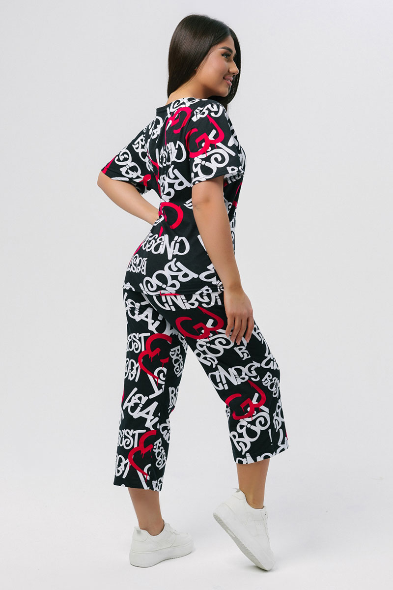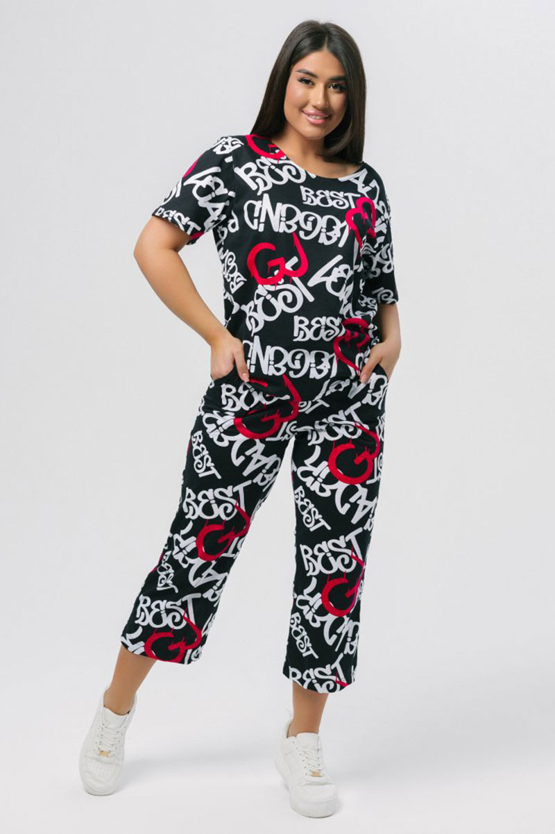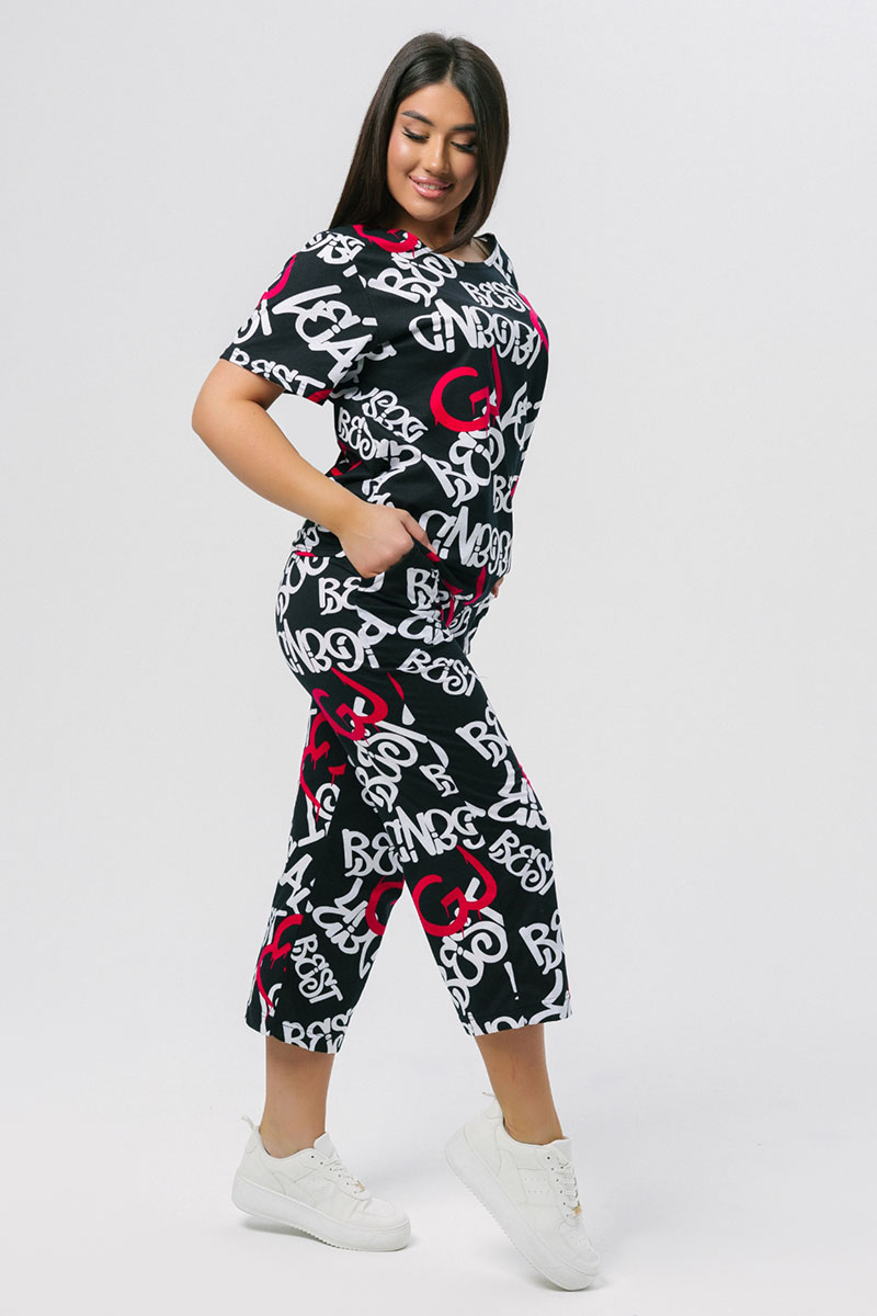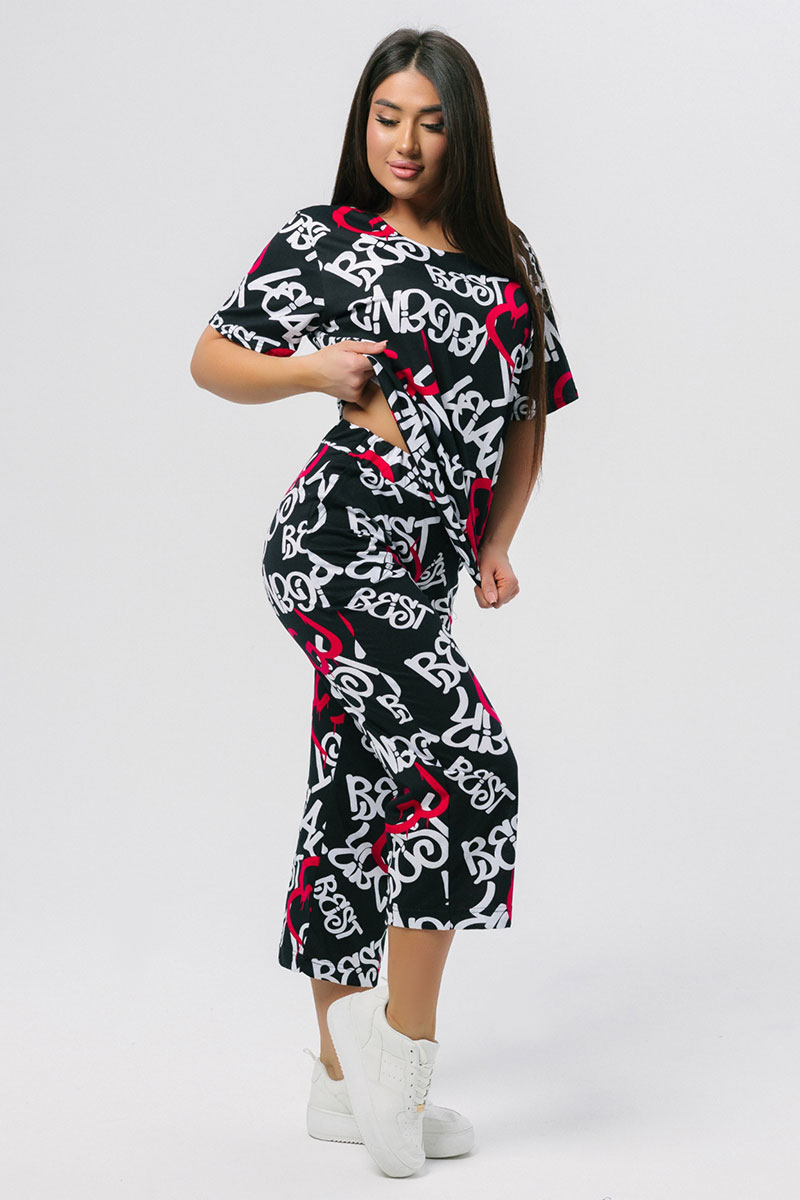Представляем Вашему вниманию замечательный женский костюм, изготовленный из качественного материала. В этом костюме Вы всегда будете чувствовать себя уютно, удобно и комфортно, так как ткань очень легкая, нежная и приятная к телу. Костюм украшен стильным рисунком и эффектно смотрится. Наряд хорошо сидит на фигуре любого типа и не стесняет движений, даря Вам уверенность в себе.