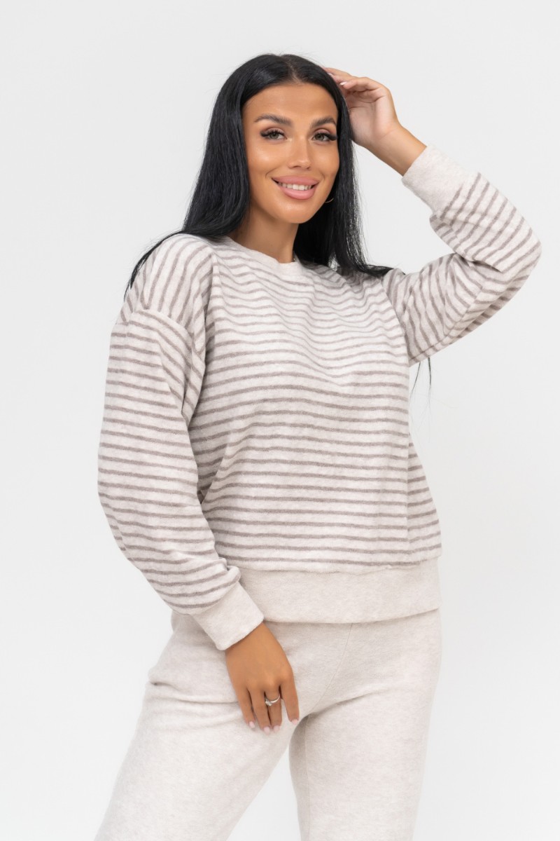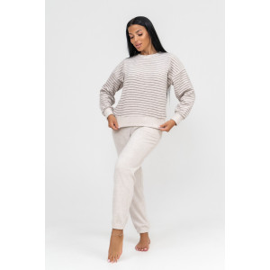 Представляем Вашему вниманию уютный женский махровый костюм, состоящий из брюк и джемпера. Брюки с карманами, низ брюк на резинке. Срезы костюма отделаны рибаной в цвет. Расположение полос может отличаться от фото.