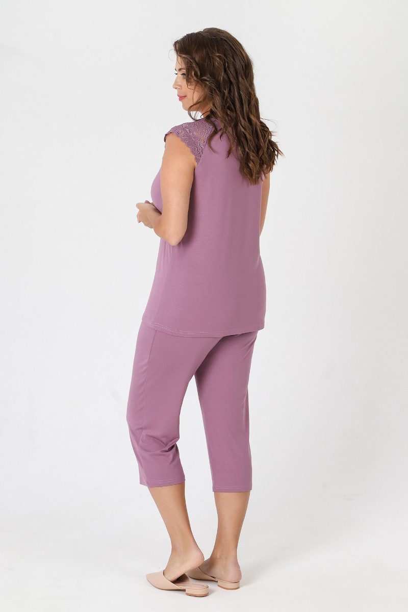 Представляем Вашему вниманию женскую пижаму из трикотажного гладкокрашенного вискозного полотна, состоящая из футболки и бридж. Футболка - слегка расширенная книзу, с короткими кружевными рукавами покроя «реглан» и горловиной овальной формы, окантованной основным материалом. По срезу горловины выполнена небольшая сборка, по центру декоративный бантик из узкой атласной ленты.Бриджи – свободного покроя, с эластичной тесьмой по талии.
