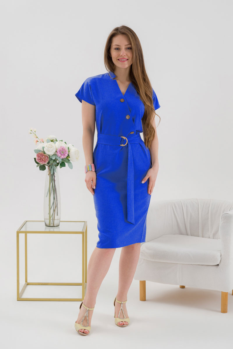 Представляем Вашему вниманию изящное женское полуприлегающее платье на запах, с симметричным воротником, отрезное по линии талии. Плечо немного спущено, что позволяет слегка прикрыть руки. Отделкой платья служат деревянные пуговицы и пояс на пряжке с помощью которого можно подчеркнуть талию.