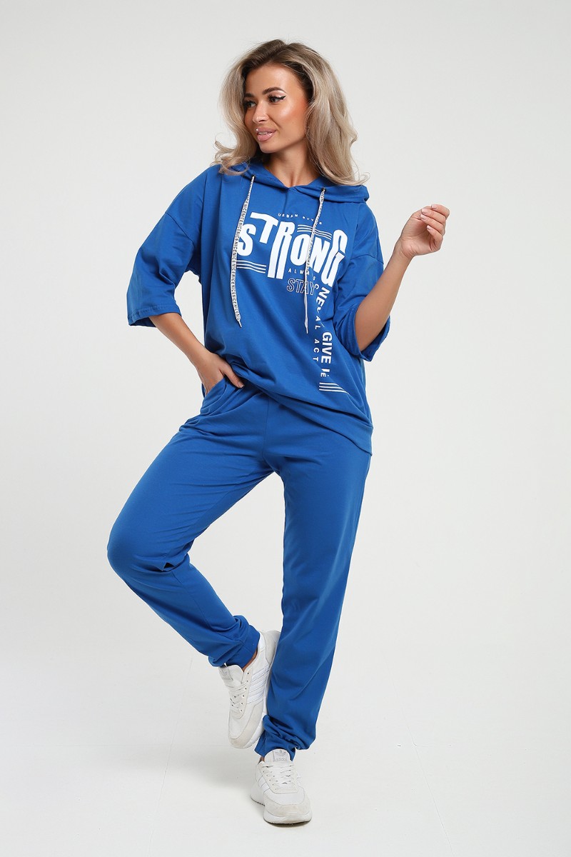 Представляем Вашему вниманию удобный женский костюм двойку, сшитый из 100% хлопка. На полочке кофты, а также на брюках - стильные монохромные принты с надписями. Рукав футболки спущенный, спинка у футболки немного удлинена. Брюки свободные, есть боковые карманы, низ на манжетах.