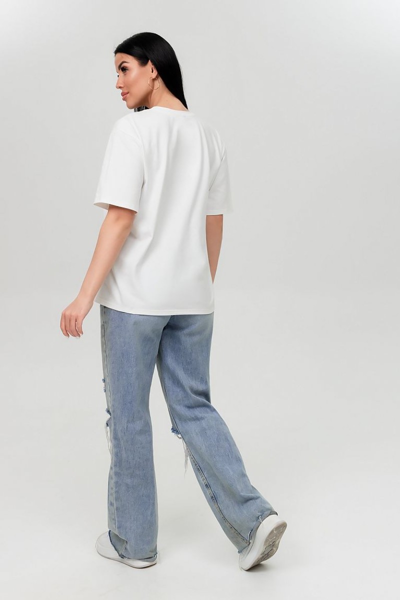 Представляем Вашему вниманию легкую женскую футболку объема оверсайз, длиной до середины бедра, плечо спущенное, рукав втачной до локтя. Горловина округлой формы с обтачкой. На середину переда нанесен дизайнерский принт. По низу настрочен жаккардовый шеврон. Горловина спинки с усилителем.