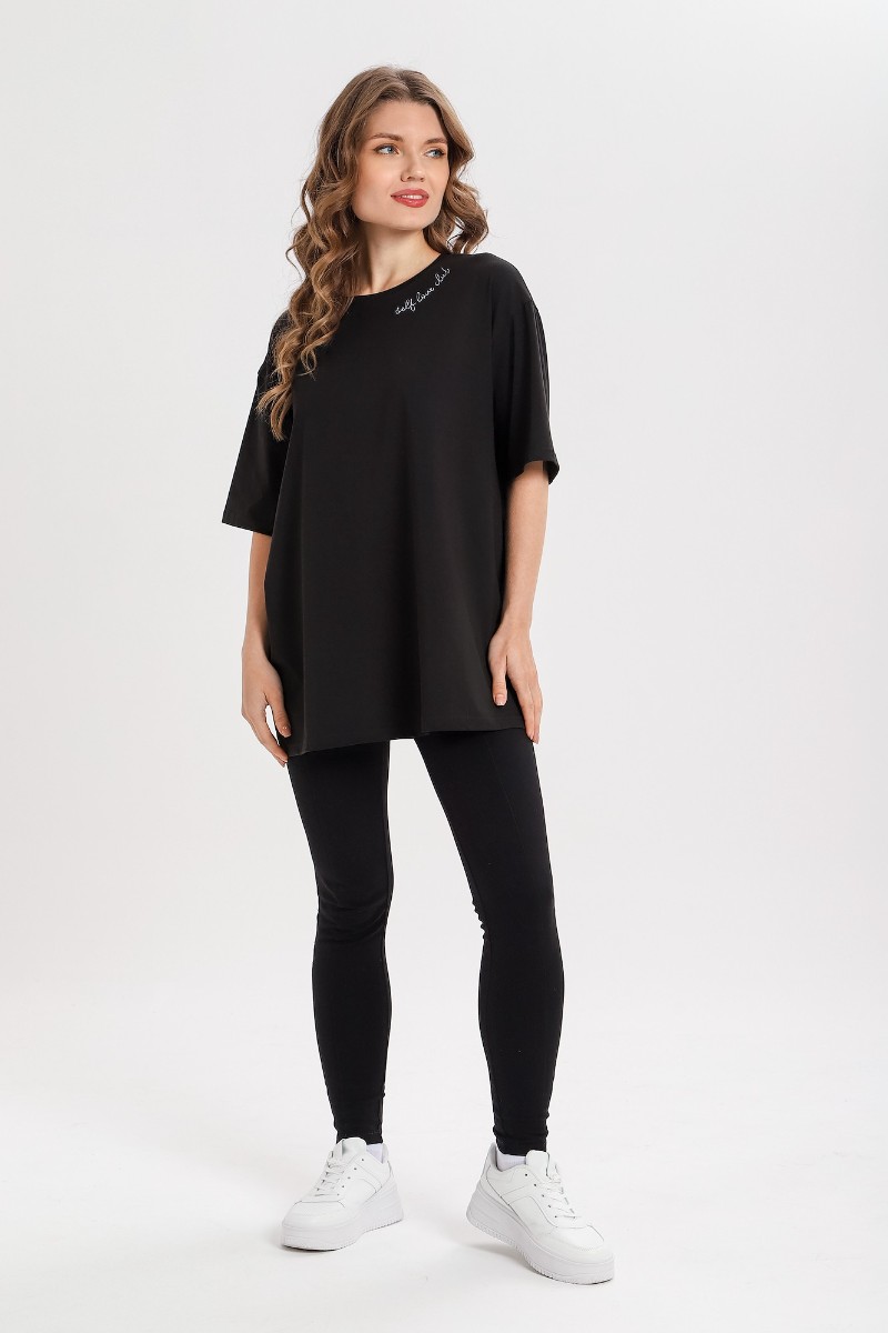 Представляем Вашему вниманию женскую футболку из гладкокрашеного трикотажного полотна «кулирка с лайкрой», свободного покроя оверсайз, с короткими втачными рукавами, горловиной овальной формы, обработанной втачной планкой, и вышивкой на полочке.