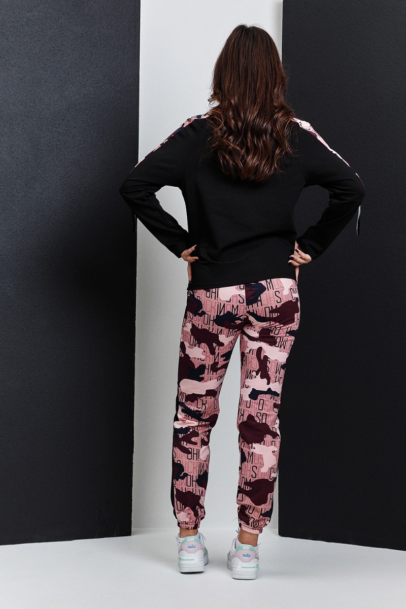 Представляем Вашему вниманию костюм, который состоит из туники и брюк. Туника прямая, с округлой горловиной, средней дины. Рукав реглан, длинный, с лампасом из отделочного полотна вдоль рукава и декоративными молниями. Горловина обработана обтачкой из эластичного полотна. Брюки прямые, на поясе, с боковыми карманами, с лампасами из отделочного полотна вдоль боковых швов, с резинкой по низу.