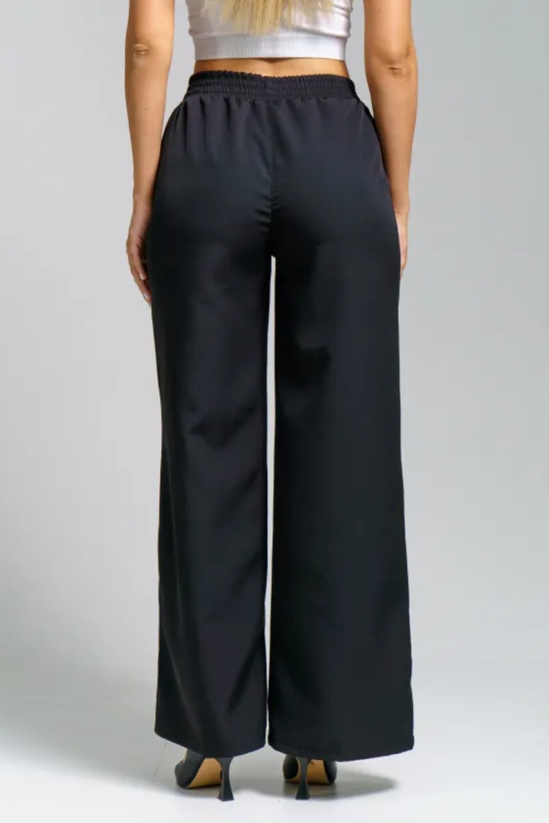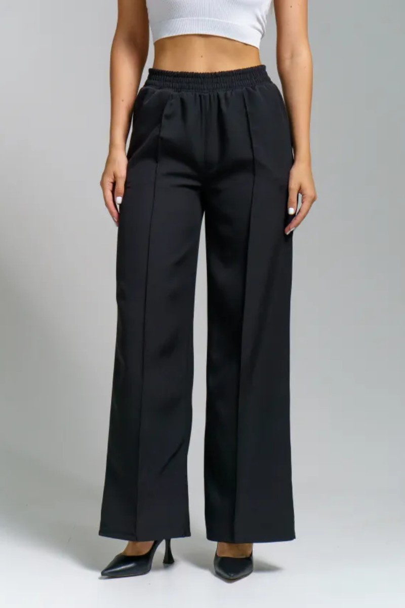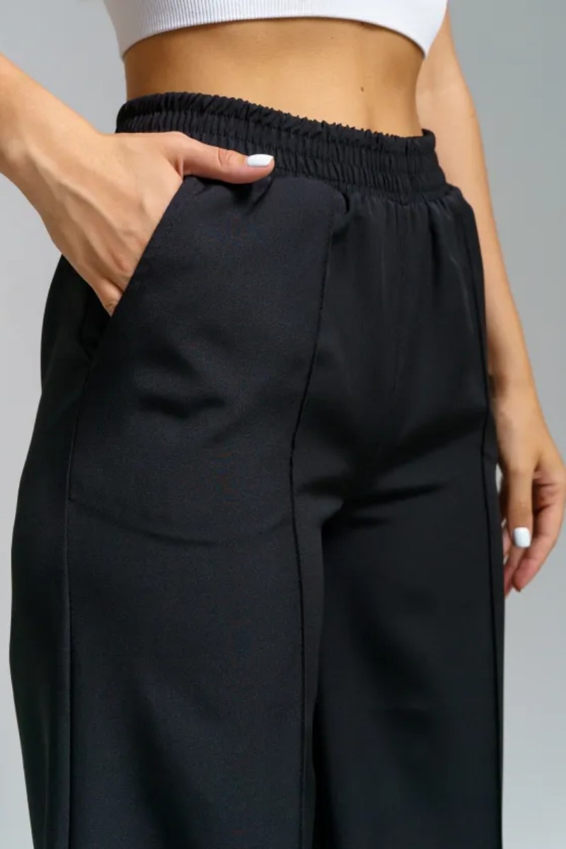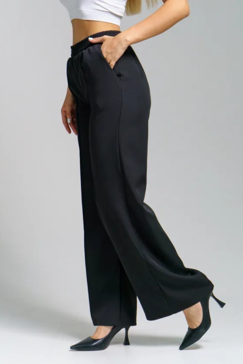 Представляем Вашему вниманию черные женские брюки палаццо со стрелкой средней посадки - базовая вещь гардероба каждой современной девушки. Клеш от бедра, гладкая ткань и фиксация на талии притачным поясом обеспечивают комфортную посадку - вот секрет красоты и удобства женских брюк. Для практичности дополнены двумя карманами. Брюки со стрелкой классические офисные костюмные - это инвестиция в стиль и уверенность в себе. Их прямой и свободный силуэт визуально удлиняет ноги, придавая фигуре стройность и изящество. Они станут идеальным вариантом как для похода в школу, офис и институт, так и для ужина в ресторане или вечерней прогулки по городу. Брюки со стрелкой классические - это стильная и элегантная одежда для деловых женщин.
