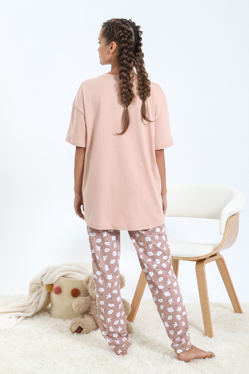Представляем Вашему вниманию женскую пижаму, состоящую из футболки и брюк. Футболка классического покроя, с короткими втачными рукавами, горловиной овальной формы, обработанной втачной планкой, фигурной линией низа и принтом в центре переда, выполненным методом шелкографии. Брюки - длинные, с эластичной тесьмой верхнему и нижним срезам.