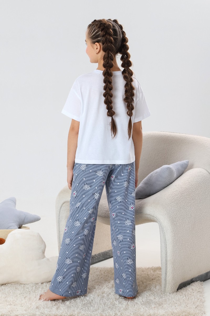 Представляем Вашему вниманию костюм для девочки, состоящий из футболки и брюк. Футболка - из гладкокрашеного полотна с принтом на детали переда, свободного покроя, укороченная, с коротким втачными рукавами и горловиной овальной формы, обработанной втачной бейкой. Нижние срезы рукавов и изделия обработаны швом вподгибку. Брюки из полотна с набивным рисунком, длинные, на притачном поясе с эластичной тесьмой внутри и карманами в боковых швах. Средний шов передних половин обработан с имитацией застежки "гульфик" с тремя декоративными пуговицами. Нижние срезы шорт обработаны швом вподгибку.