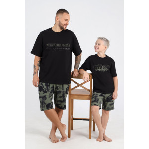 Представляем Вашему вниманию костюм мужской из трикотажного полотна "кулирка", состоящий из футболки и шорт. Футболка - из гладкокрашеного полотна, классического покроя, с горловиной овальной формы, обработанной втачной планкой, короткими втачными рукавами и принтом на полочке, выполненным в технике шелкографии. Шорты - из полотна с набивным рисунком, удлиненные, на притачном поясе с эластичной тесьмой внутриии карманами с окантованными входами в боковых швах.