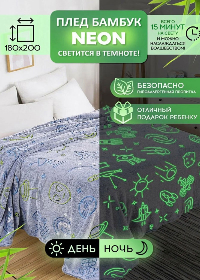 Уникальный принт светится в темноте, создавая невероятную и волшебную атмосферу. Мягкий и уютный плед-одеяло не хочется выпускать из рук. Оставьте плед на 15 минут в светлом помещении и наслаждайтесь волшебством! Пропитка элементов абсолютно безопасна для использования и гипоаллергенна. Такой плед станет отличной идеей подарка для ребенка, как мальчику так и девочке, на любой праздник или событие.